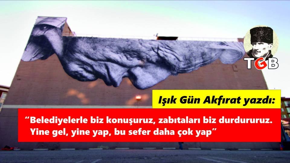 Şimdi de İstanbul Fatih’te duvarlardan seslenen sanatın sesini duymuş ve yine susturmanın yolunu bulmuşlar: Griye boyamak! Dünyaca ünlü graffiti sanatçısı JR, metruk bir binaya, çizdiği gözleri kapalı bir adam portresiyle soluk vermiş, yaşam katmış. Birazcık gözlerini açsalar, birazcık kulak verseler orada Orhan Veli’nin “İstanbul’u dinliyorum, gözlerim kapalı” dizelerini görebilir, duyabilirlerdi ama nerede… Gördükleri şey kentin çarpık çurpukluğu içinde yeşeren ve dolayısıyla “semtin silüetini bozan” bir resimdi. Aslında resim de griydi, ama içinde yaşamdan kıpırtılar taşıyan bir resimdi sonuçta. Ve dünyayı dolaşan bir sanatçının yurdumuzdan geçerken bize yaptığı güzellik, şimdi grinin tek bir tonuyla örtüldü. Slogan olsa yine yazarız ama, portre olunca insan öfkeleniyor.