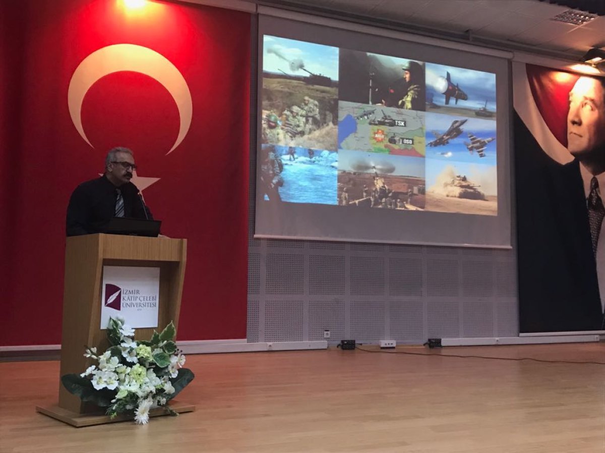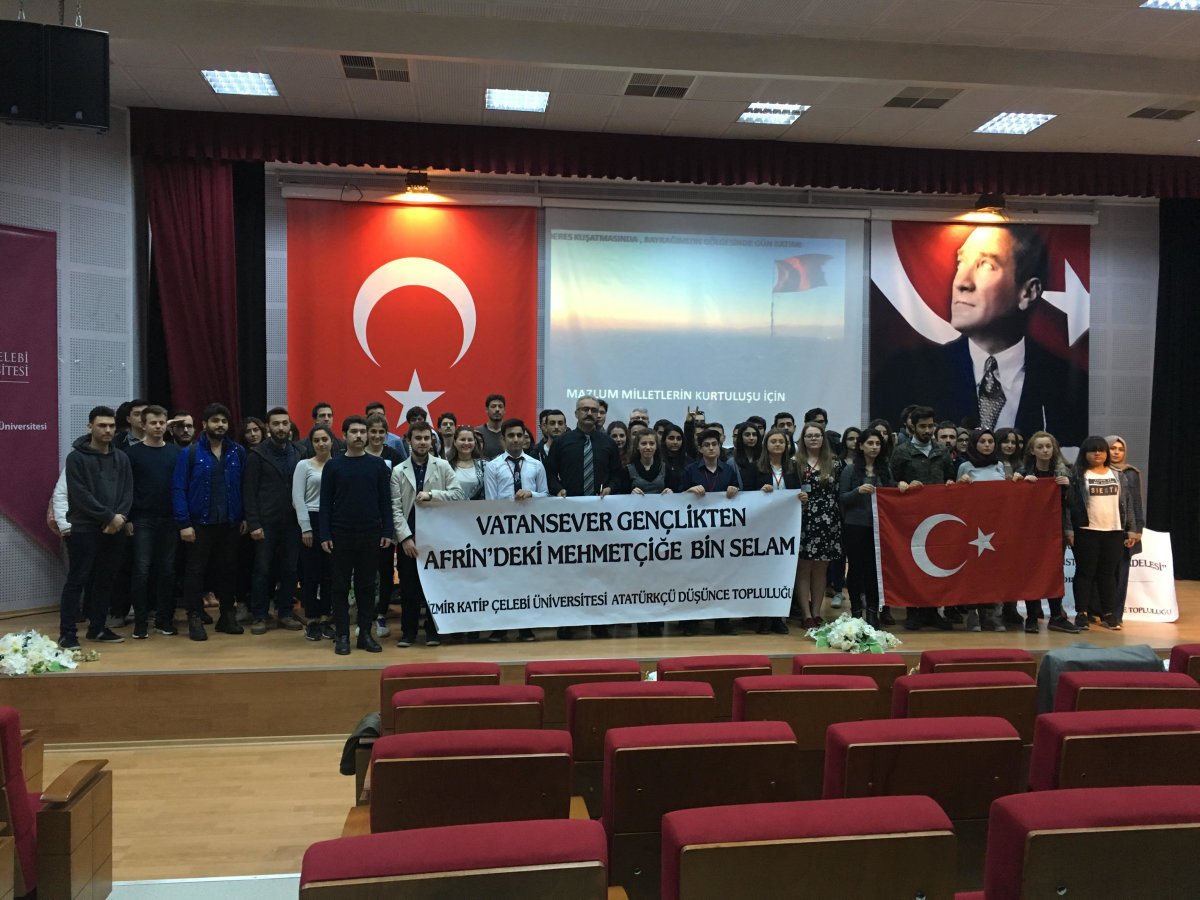 Katip Çelebi Üniversitesi Atatürkçü Düşünce Topluluğu nun düzenlediği “Çanakkale Savaşından Günümüze İstiklal Savaşı” konulu konferans, Vatan Partisi MKK Üyesi Oktay Yıldırım’ın katılımıyla gerçekleşti. İstiklal Marşı ve saygı duruşunun ardından başlayan konferansın açılış konuşmasını Atatürkçü Düşünce Topluluğu Başkanı İrem Özcan yaptı.