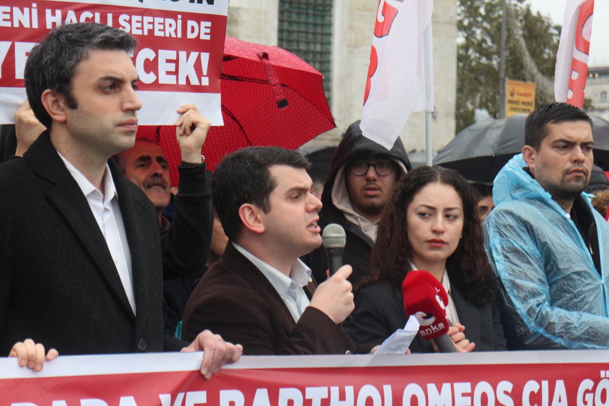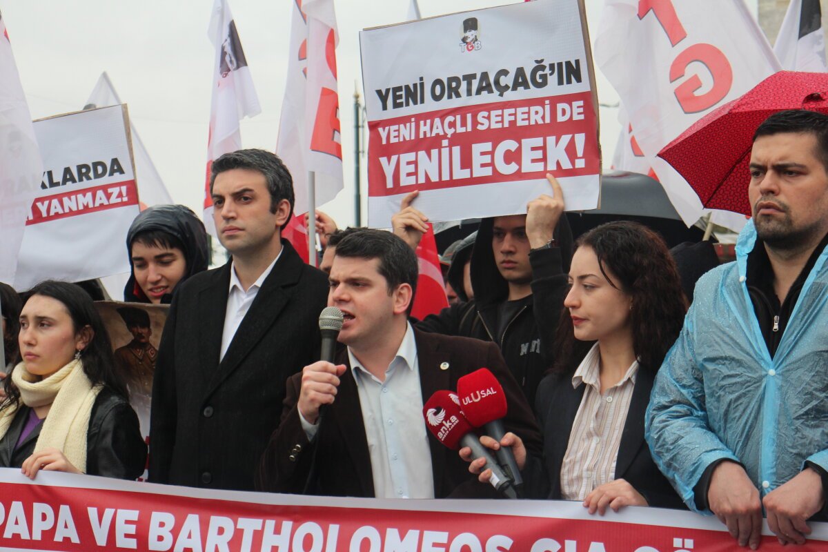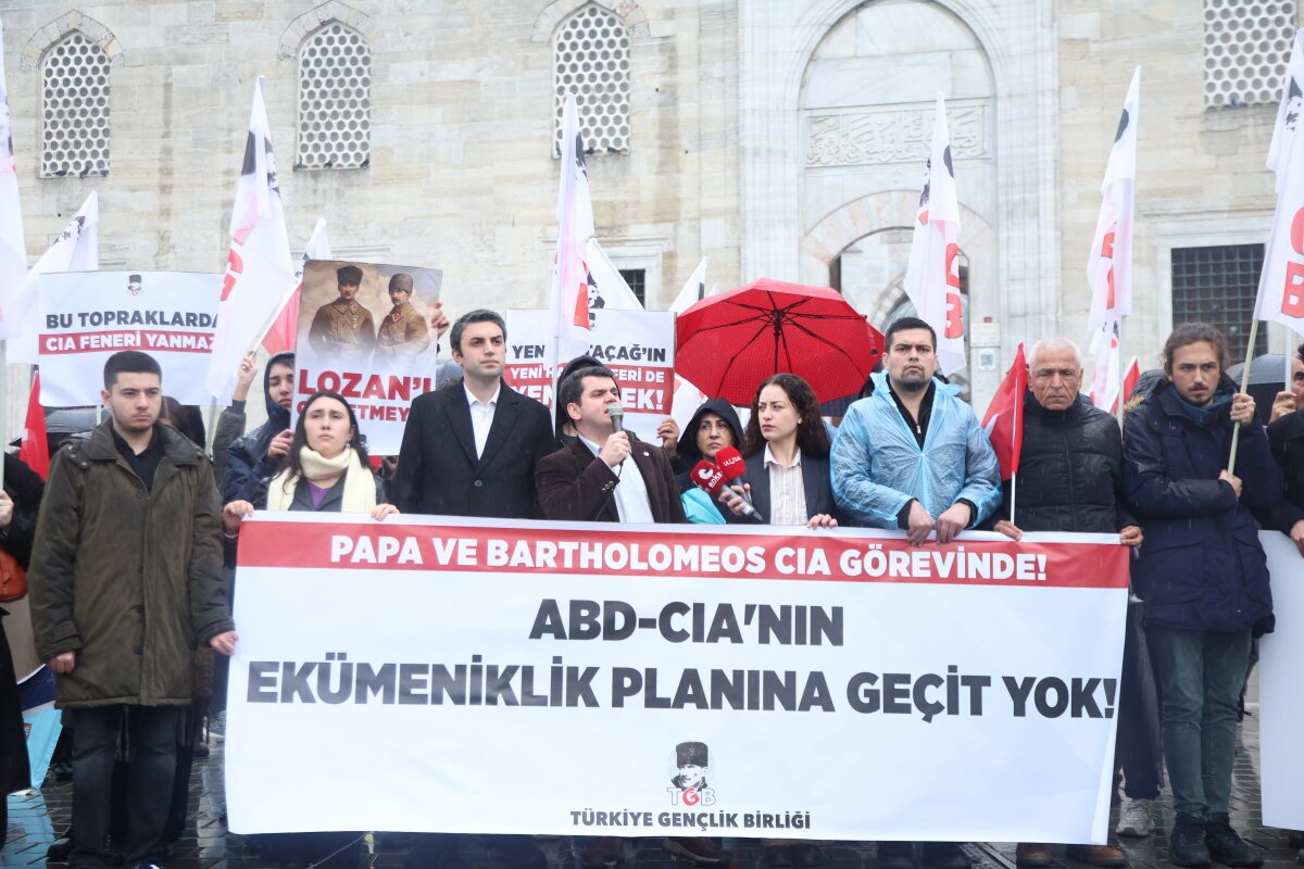 Türkiye Gençlik Birliği (TGB), Papa 14. Leo ve Fener Rum Patriği Bartholomeos’un “Ekümeniklik” planına karşı Eminönü Meydanı’nda basın açıklaması yaptı. TGB Genel Başkanı Kayahan Çetin, “Bu bir din meselesi değil, ABD ve CIA’nın Türkiye ve Rusya’ya karşı başlattığı modern bir Haçlı Seferidir. Bu topraklarda CIA feneri yanmaz” dedi.