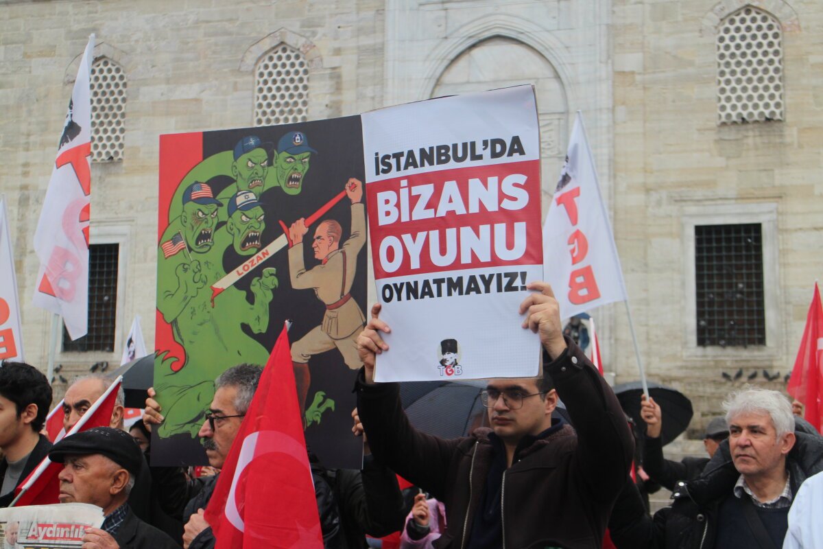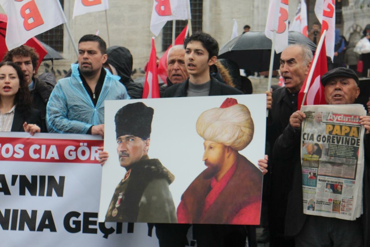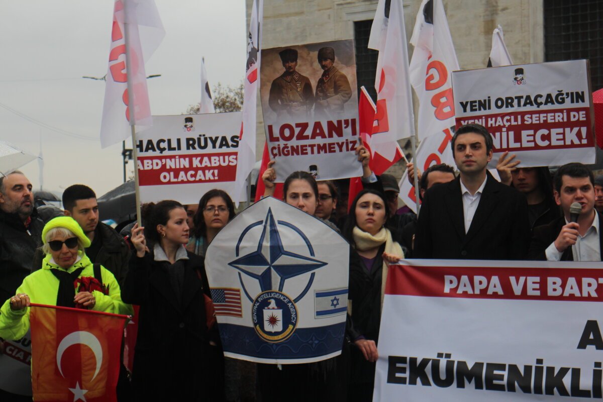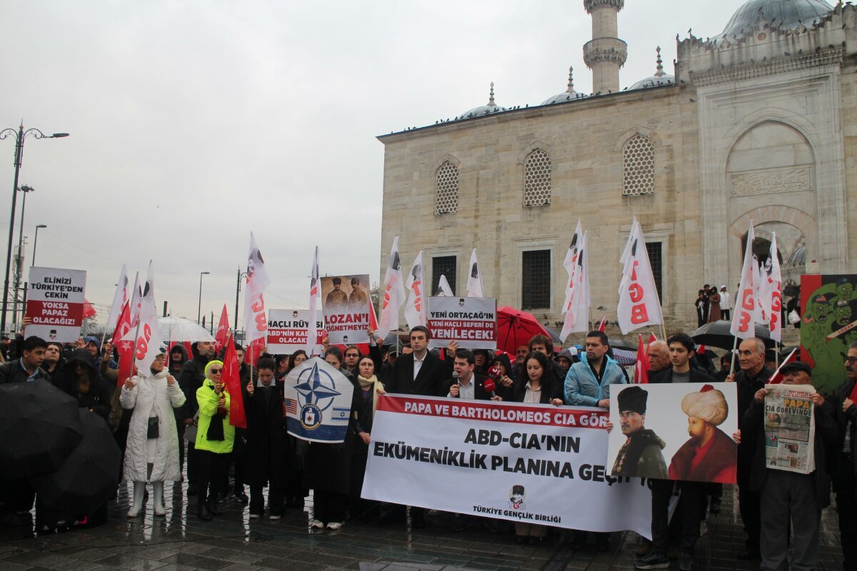 Türkiye Gençlik Birliği, Papa 14. Leo’nun Türkiye ziyareti ve bugün Fener Rum Patriği Bartholomeos ile imzaladığı ortak antlaşmaya karşı Eminönü Meydanı’nda bir basın açıklaması gerçekleştirdi. Ellerinde Türk bayrakları ve “ABD-CIA’nın Ekümeniklik Planına Geçit Yok” pankartıyla Patrikhanenin kapısına dayanan TGB üyeleri, atılan adımları Türkiye’nin egemenliğine ve Lozan Antlaşması’na saldırı olarak nitelendirdi.
