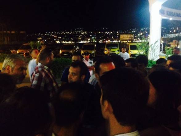 Yedi arkadaşımız gözaltına alındı. Gözaltındaki arkadaşlarımız elleri kelepçeli şekilde karanlık bir odada tutuldu. Hastanede sağlık kontrolü yapılan arkadaşlarımız elleri kelepçeli şekilde Kuşadası Karakolu’na getirildi.