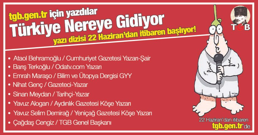Türkiye’nin öncü aydınları tgb.gen.tr için yazdılar. Cumhuriyet Gazetesi Köşe Yazarı ve Şair Ataol Behramoğlu, Odatv.com yazarı Barış Terkoğlu, Bilim ve Ütopya Dergisi Genel Yayın Yönetmeni Emrah Maraşo, Yazar Nihat Genç, Tarihçi Yazar Sinan Meydan, Aydınlık Gazetesi Köşe Yazarı Yavuz Alogan, Yeniçağ Gazetesi Köşe Yazarı Yavuz Selim Demirağ ve TGB Genel Başkanı Çağdaş Cengiz 22 Haziran’dan itibaren tgb.gen.tr’de!