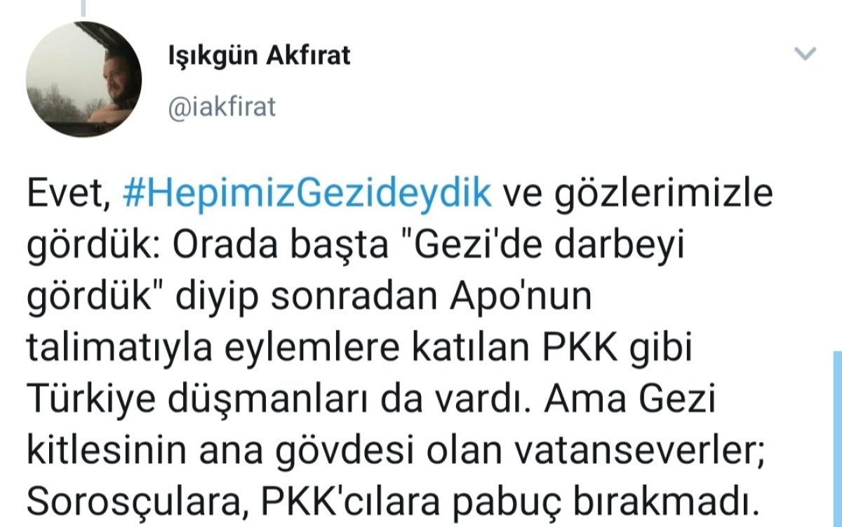 - Evet, hepimiz Gezi’deydik ve gözlerimizle gördük: Orada başta “Gezi’de darbeyi gördük” diyip sonradan Apo’nun talimatıyla eylemlere katılan PKK gibi Türkiye düşmanları da vardı. Ama Gezi kitlesinin ana gövdesi olan vatanseverler; Sorosçulara, PKK’cılara pabuç bırakmadı.
