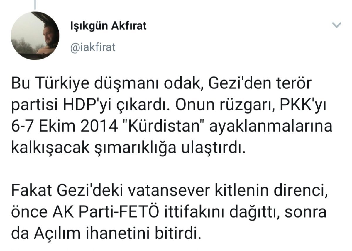 - Bu Türkiye düşmanı odak, Gezi’den terör partisi HDP’yi çıkardı. Onun rüzgarı, PKK’yı 6-7 Ekim 2014 “Kürdistan” ayaklanmalarına kalkışacak şımarıklığa ulaştırdı. Fakat Gezi’deki vatansever kitlenin direnci, önce AK Parti-FETÖ ittifakını dağıttı, sonra da Açılım ihanetini bitirdi.