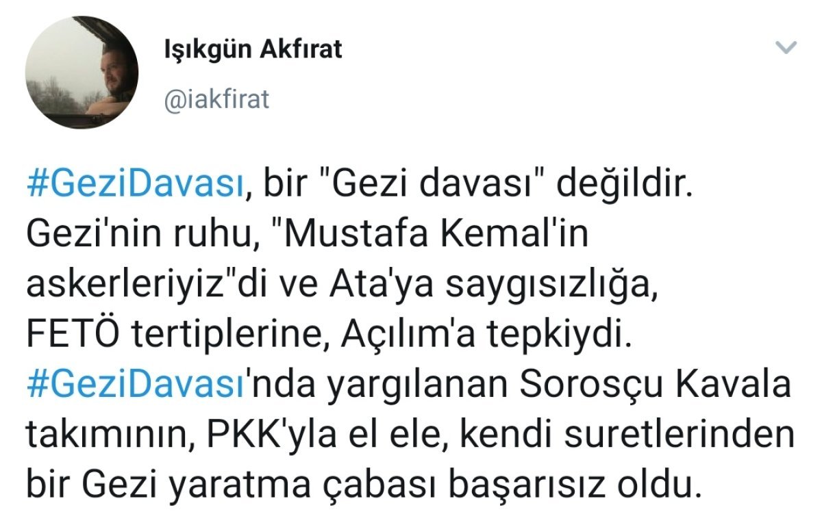 - Gezi Davası, bir “Gezi Davası” değildir. Gezi’nin ruhu, “Mustafa Kemal’in Askerleriyiz”di ve Ata’ya saygısızlığa, FETÖ tertiplerine, Açılım’a tepkiydi. Gezi Davası’nda yargılanan Sorosçu Kavala takımının, PKK’yla el ele, kendi suretlerinden bir Gezi yaratma çabası başarısız oldu.