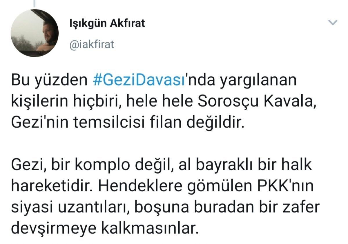 - Bu yüzden Gezi Davası’nda yargılanan kişilerin hiçbiri, hele hele Sorosçu Kavala, Gezi’nin temsilcisi filan değildir. Gezi, bir komplo değil, al bayraklı bir halk hareketidir. Hendeklere gömülen PKK’nın siyasi uzantıları, boşuna buradan bir zafer devşirmeye kalkmasınlar.