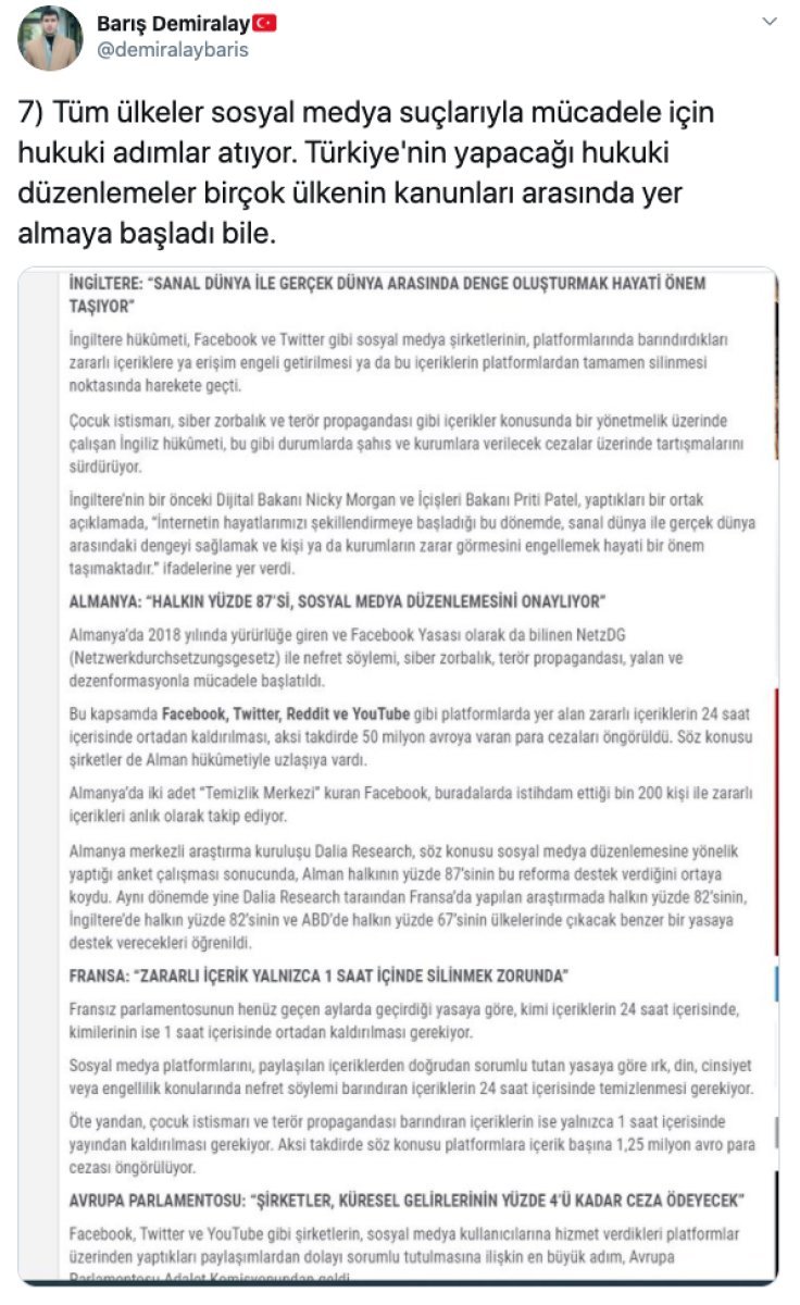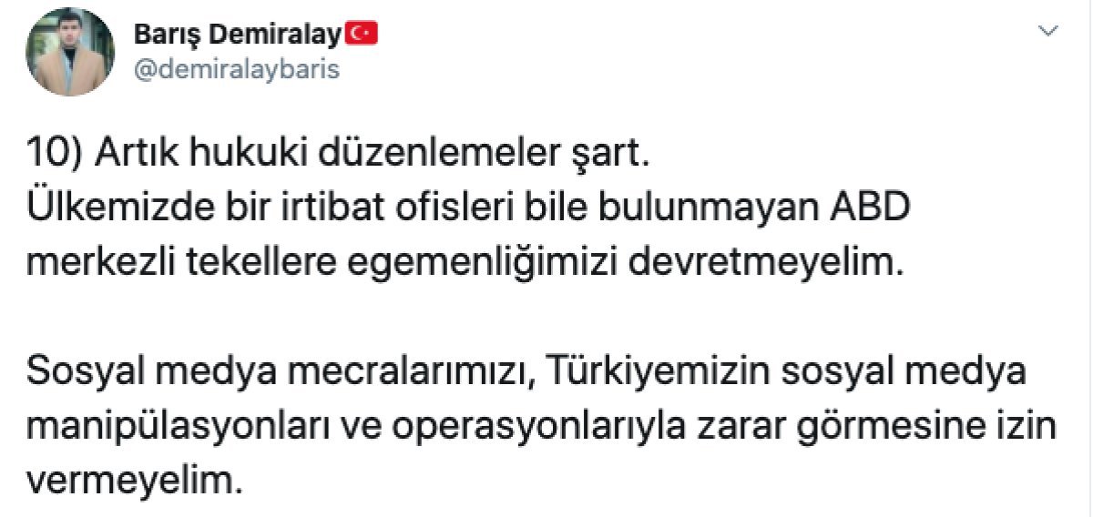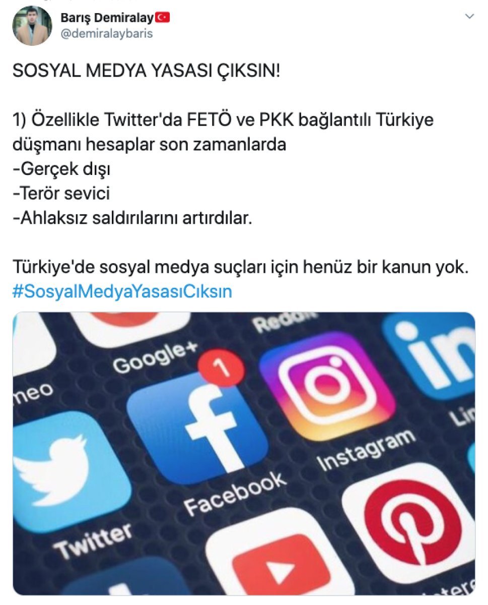 Cumhurbaşkanı Recep Tayyip Erdoğan, partisinin Genişletilmiş İl Başkanları Toplantısında sosyal medya platformlarının yaydığı ahlaksızlıklara dikkat çekti. Türkiye Gençlik Birliği olarak biz de sosyal medyadaki ahlaksızlık, terör seviciliği ve Türkiye düşmanlığına karşı bu alana dair denetimin arttırılmasından yanayız. Bu yüzden derhal sosyal medya yasası çıkarılmalıdır.