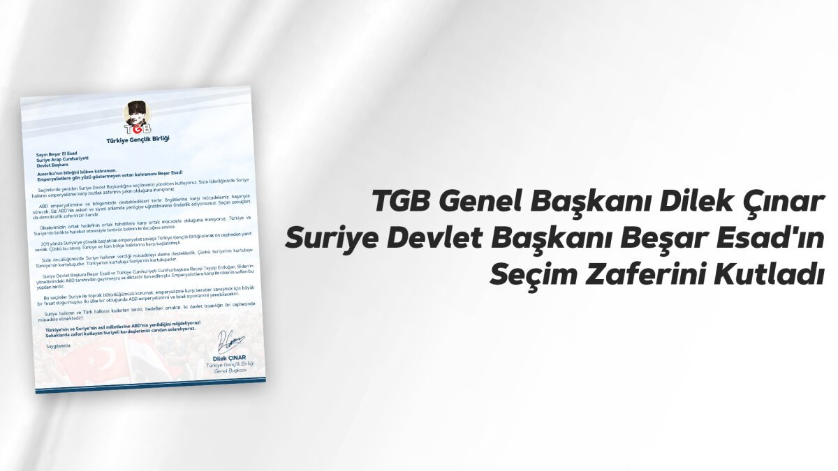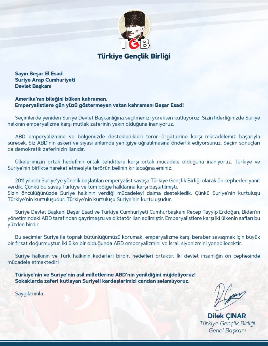 2011 yılında Suriye’ye yönelik başlatılan emperyalist savaşa Türkiye Gençlik Birliği olarak ön cepheden yanıt verdik. Çünkü bu savaş Türkiye ve tüm bölge halklarına karşı başlatılmıştı.Sizin öncülüğünüzde Suriye halkının verdiği mücadeleyi daima destekledik. Çünkü Suriye’nin kurtuluşu Türkiye’nin kurtuluşudur. Türkiye’nin kurtuluşu Suriye’nin kurtuluşudur.