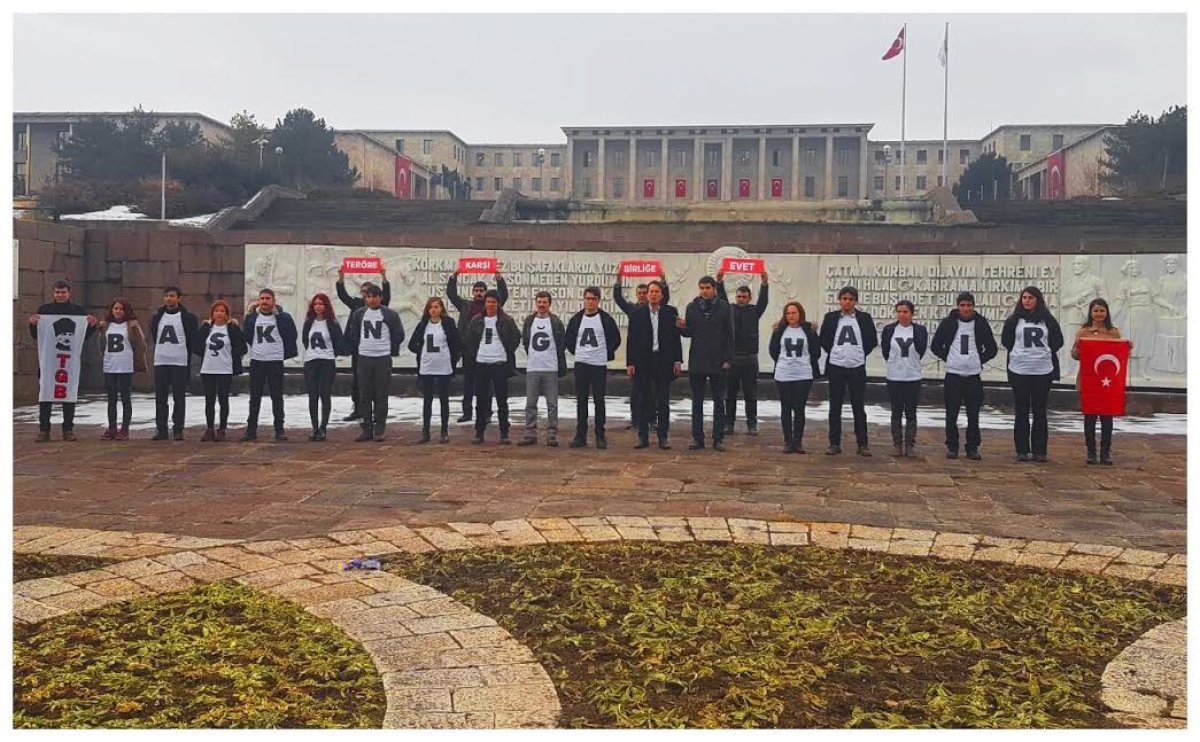 TGB’liler anayasa tartışmalarını Türkiye Büyük Millet Meclisi önünde protesto etti. TBMM önünde buluşan TGB’liler, tişört ve atkılarla ‘Teröre Karşı Birliğe Evet, Başkanlığa Hayır’ yazdı. TGB Genel Başkanı Çağdaş Cengiz, meclis önündeki açıklamasında başkanlık sisteminin milletin birliğini bozacağını belirterek, ‘‘Türkiye Gençlik Birliği olarak TBMM önünden milletvekillerimize sesleniyoruz.
