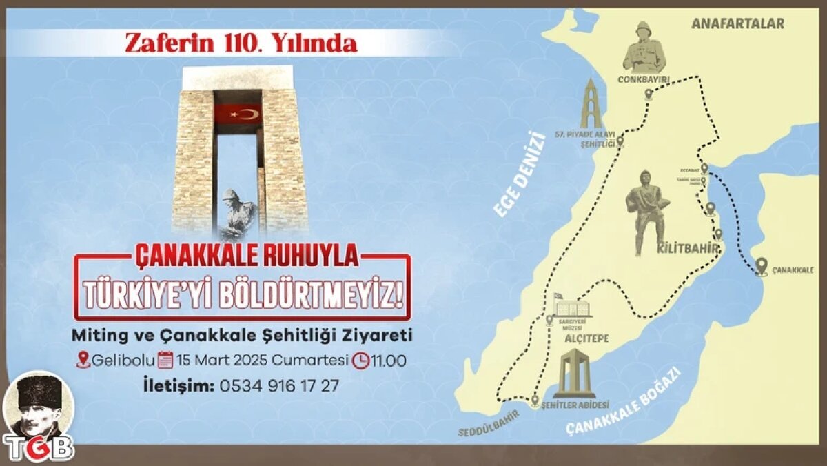Türkiye Gençlik Birliği (TGB), Çanakkale Deniz Zaferi’nin 110. yılı dolayısıyla yapacağı eylemin rotasını açıkladı. TGB, Türk gençliğini Çanakkale ruhunda birleştirmek, Türkiye’ye yönelik tehditlerin büyüdüğü bu süreçte gençliğe yüklenen görev ve bilinci tüm Türkiye’ye yaymak için Çanakkale’de büyük bir görüntü vermeye hazırlanıyor. Mitinge beş gün kala “Çanakkale Geçilmez, Türkiye Bölünmez” diyerek vatandaşları önce Çanakkale Şehitler Parkı’nda düzenlenecek mitinge ve ardından yapılacak ziyaret rotasında buluşmaya davet eden gençler, ABD-İsrail güdümlü tehditlere karşı Türk milletini kenetlenmeye çağırdı. Edirne’den Hakkari’ye kadar Türkiye’nin tüm cadde ve sokaklarını afiş ve bildirilerle süsleyen gençler, üniversitelerde ve şehir meydanlarında açtığı masalarla da tüm vatanseverleri 15 Mart’ta Çanakkale’ye davet etti. Başı dik yaşamak için ABD-İsrail’e karşı mücadele kararlılığını yükselten TGB, son beş güne girerken üniversite ve liselerde yaptığı çalışmaları Aydınlık’a anlattı.