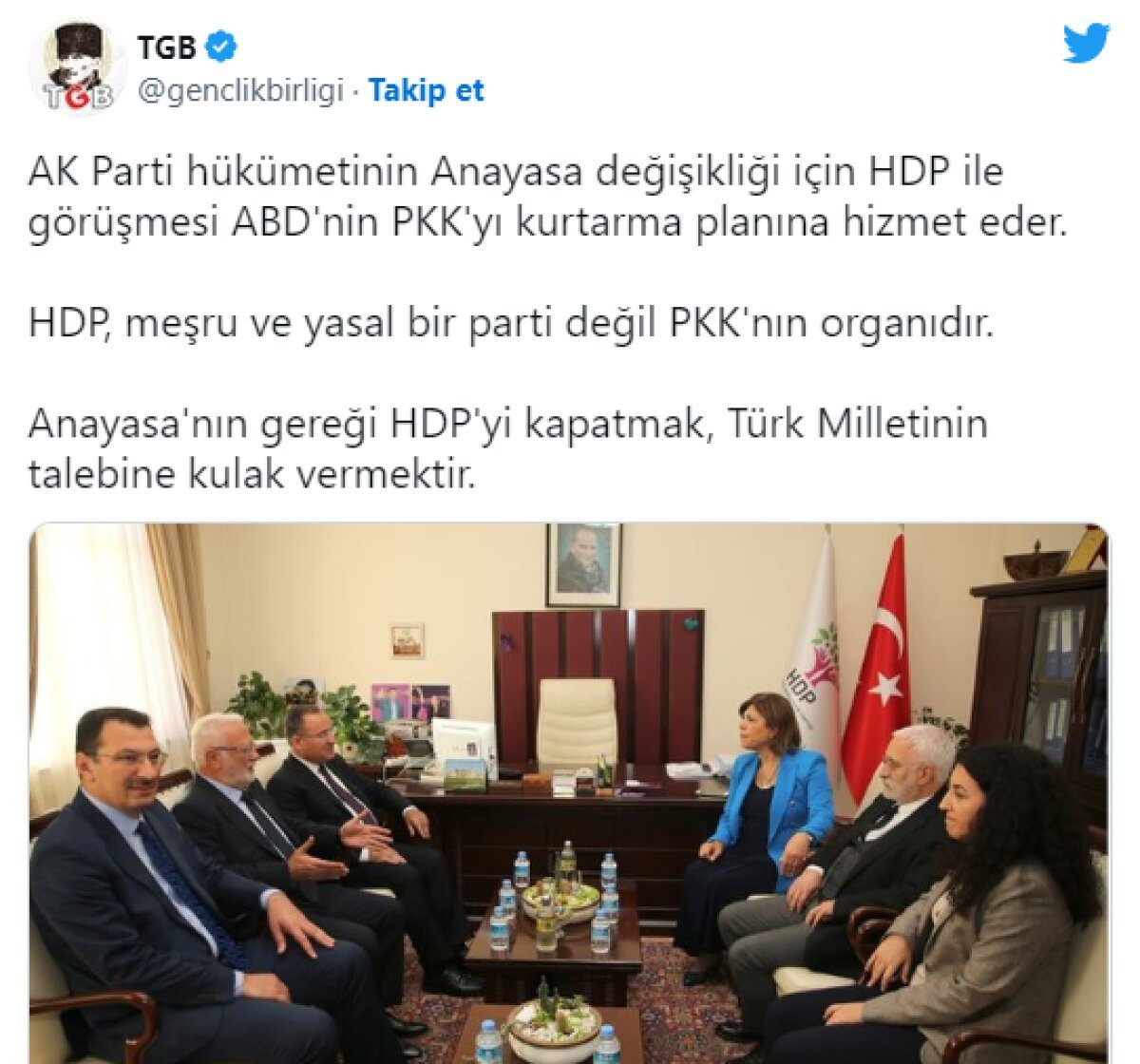 Türkiye Gençlik Birliği (TGB) sosyal medya hesabından yaptığı paylaşımda, AK Parti hükümetinin Anayasa değişikliği için HDP ile görüşmesine “ABD’nin PKK’yı kurtarma planına hizmet eder.” diyerek tepki gösterdi.