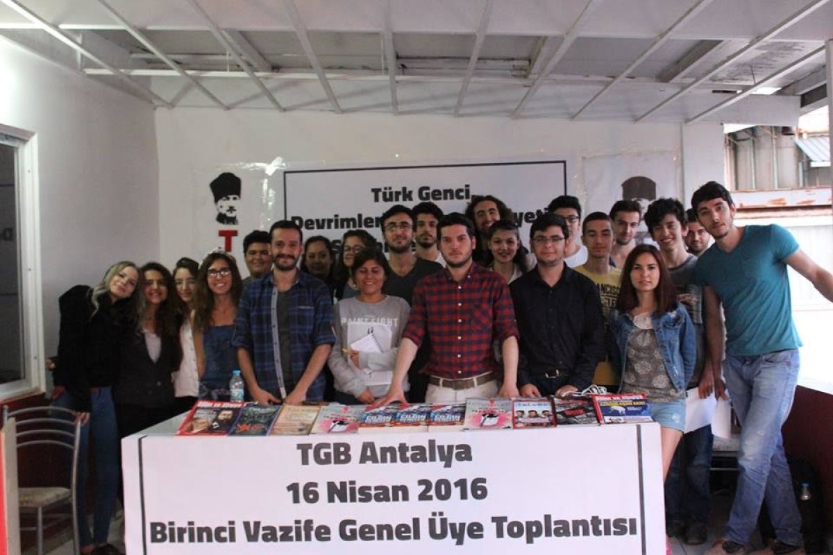 TGB Antalya genel üye toplantısını gerçekleştirdi. Nisan ve Mayıs aylarındaki takvimin belirlendiği toplantıda, 19 Mayıs’ta yapılacak Birinci Vazife yürüyüşü çalışmaları için görev dağılımı yapıldı. Akdeniz Üniversitesinde yapılacak propaganda çalışmaları planlandı. AKP’nin bölücü anayasasına karşı çalışma planlaması yapıldı. Kırmızı-Beyaz dergisinin dağıtım hedefleri belirlendi. 10. Yıl Dayanışma yemeği planlaması ve görevlendirmeleri gerçekleştirildi. TGB Antalya genel üye toplantısı “Birinci Vazife”nin yerine getirileceğine dair kararlılık ortaya konularak sona erdi.