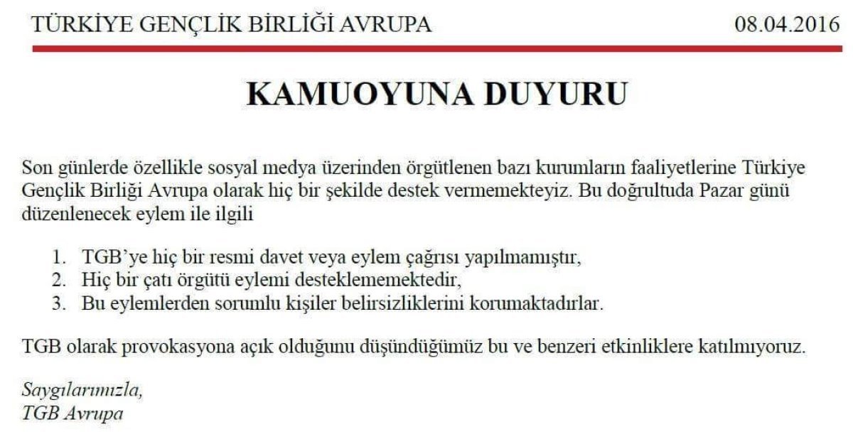 Son günlerde özellikle sosyal medya üzerinden örgütlenen bazı kurumların faaliyetlerine Türkiye Gençlik Birliği Avrupa olarak hiç bir şekilde destek vermemekteyiz. Bu doğrultuda Pazar günü düzenlenecek eylem ile ilgili