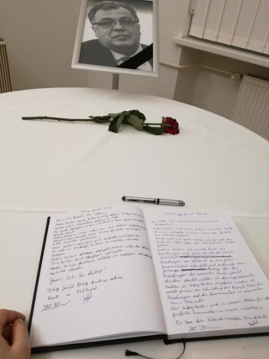 Rus elcilik görevlilerine, Avusturya’da yaşayan Türk halkını temsilen geldiklerini beyan eden Emre Er ve Elif Baykal, sıcak karşılandı. TGB heyetine Andrej Karlow için hazırlanan taziye defterine duygularını ve düşüncelerini yazma imkanı sunuldu.