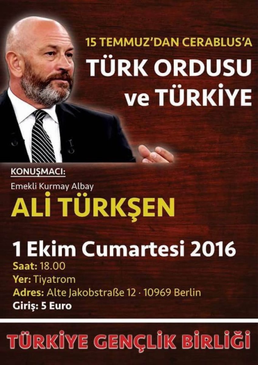 T.C. Berlin Eski Deniz Ataşesi, Emekli Kurmay Albay Ali Türkşen, yarın (1 Ekim 2016) Türkiye Gençlik Birliği’nin konuğu olarak Berlin’de bir konferans veriyor. Berlin-Tiyatrom’da saat 18.00’de başlayacak konferansta, “15 Temmuz’dan Cerablus’a: Türk Ordusu ve Türkiye” konusu Kardak Kahramanı Ali Türkşen tarafından değerlendirilecek. 15 Temmuz Amerikancı Fethullahçı Terör Örgütü FETÖ’nün Darbe Girişimi sonrası televizyonlarda Atatürkçü duruşuyla dikkat çekti.