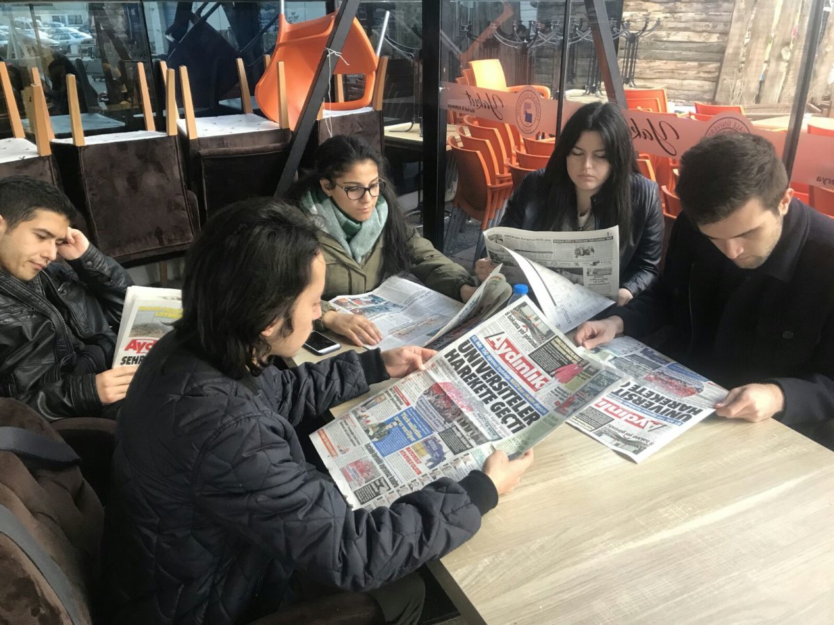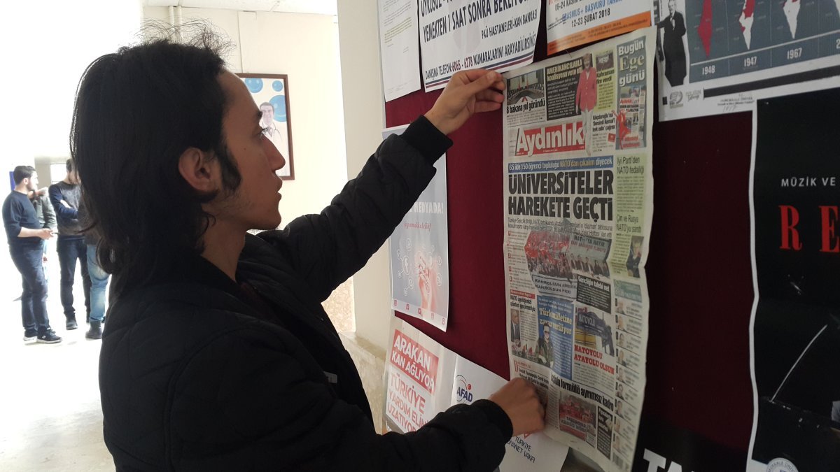TGB Denizli, Aydınlık gazetesinin birinci sayfasını üniversitedeki panolara asarak NATO’ya Hayır haftası haberinin öğrencilerin okumasını sağladı.