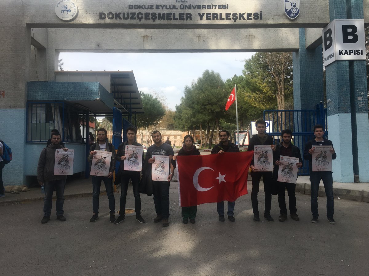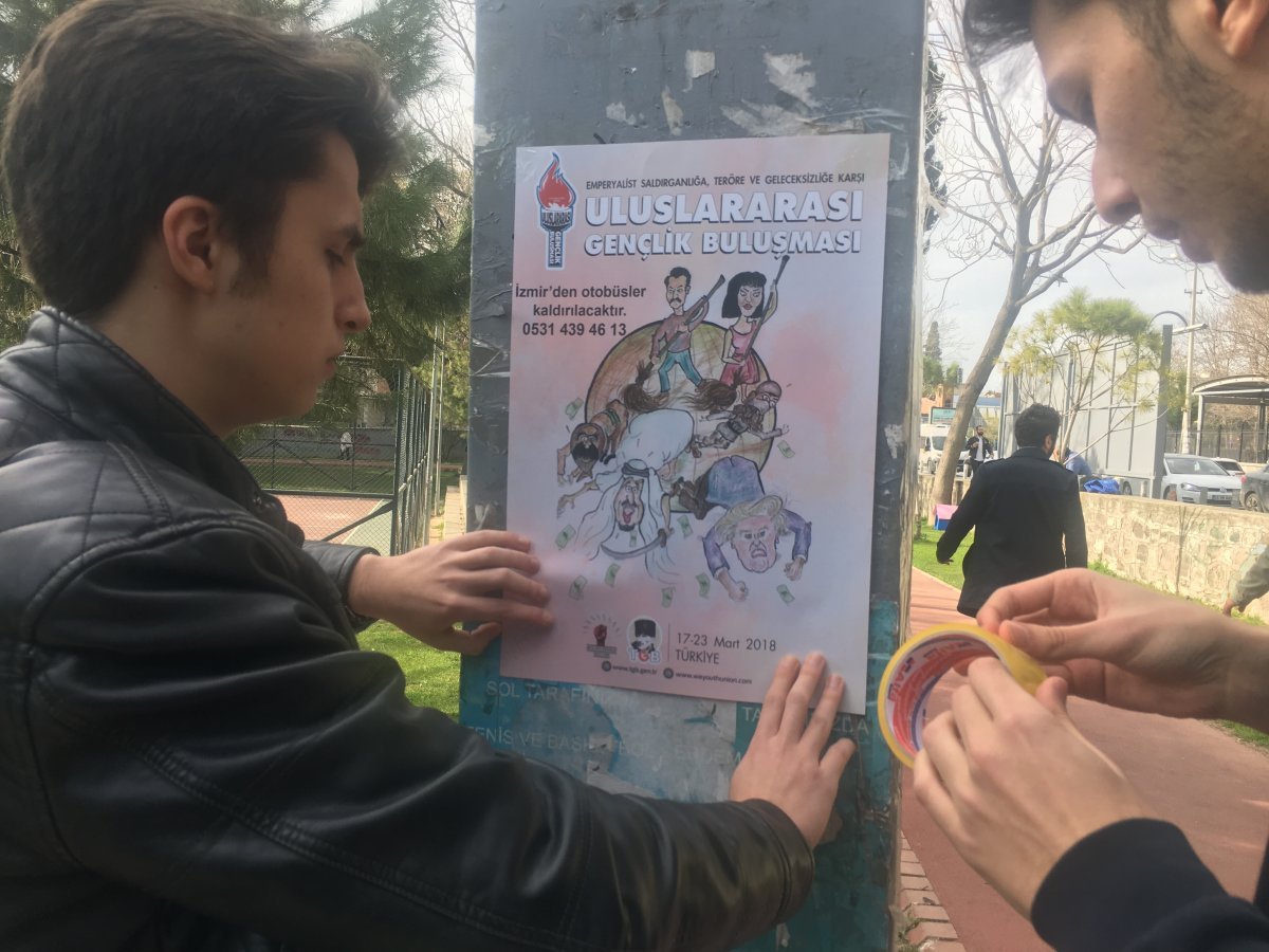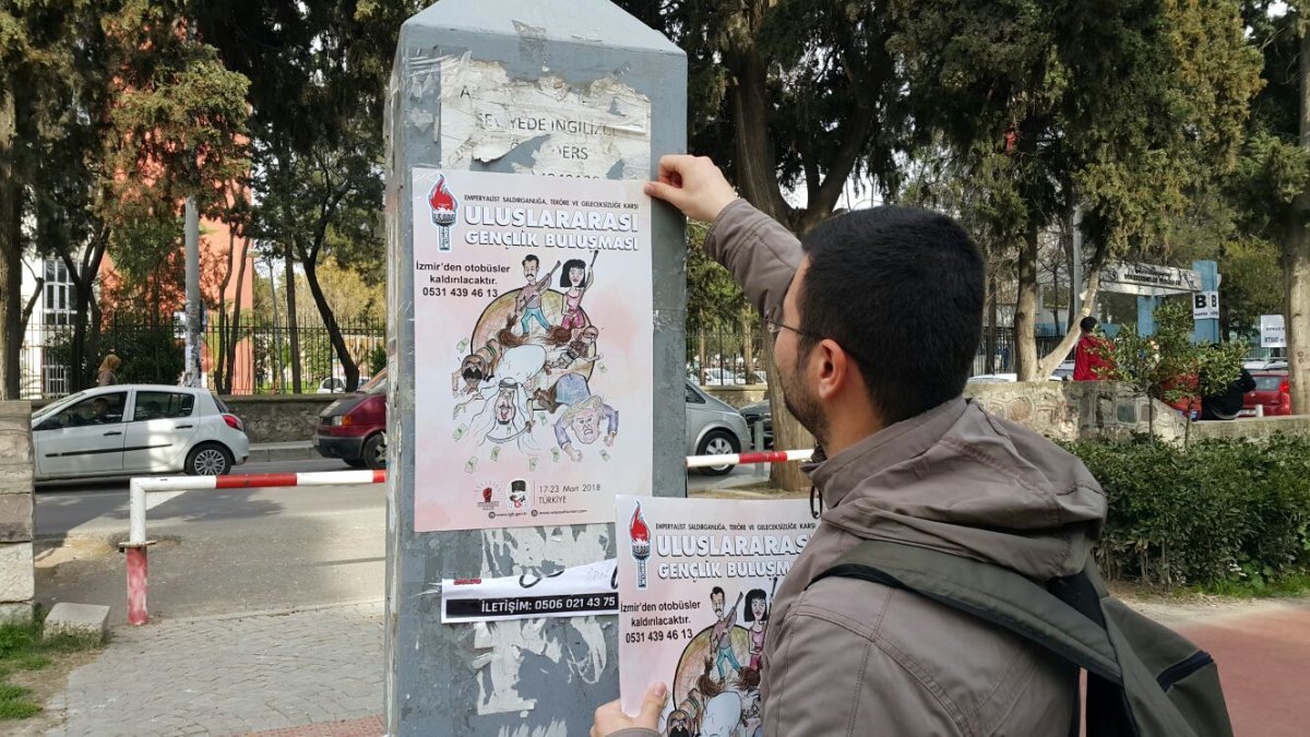 TGB Dokuz Eylül, İktisadi ve İdari Bilimler Fakültesi ve Eğitim Fakültesi çevresinde yaptıkları afiş çalışmasıyla, 17-23 Mart tarihleri arasında İstanbul ve Ankara’da teröre karşı birlik mesajı vereceğimiz Anti-Emperyalist Gençlik Buluşması’nın çağrısını yaptı.