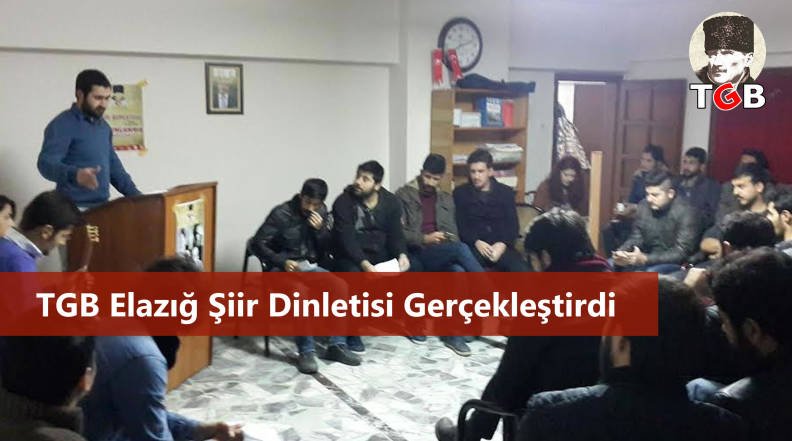 TGB Elazığ, Nazım Hikmet , Attila İlhan , Turgut Uyar , Ahmet Arif , Cemal Süreya gibi şairlerimizin tanıtıldığı ve şiirlerin tek tek okunduktan sonra türkülerin söylendiği bir şiir gecesi yaptı.”29 Ekim 1923’te Cumhuriyetin ilan edilmesiyle edebiyatta da yeni bi dönem başlamış olur.Cumhuriyet döneminde herşeyden önce halk dili ile edebiyat dili arasında bi yakınlaşma olur.Eserlerde halk diline, mahalle söyleşilerine yer verilir.Şiirlerde kullanılan Türkçe inanılmaz şekilde sadedir.Kısacası bu dönem de dilde olan sadeleşme hareketi amacına ulaşmıştır” vurgularının yapıldığı şiir gecesi öğrencilerin yoğun ilgisini çekti.Şiir gecesinde Aydınlanma ayına vurgu yapılarak, aydınlanmacı şairlerimiz şiirleriyle anıldı.tgb.gen.tr