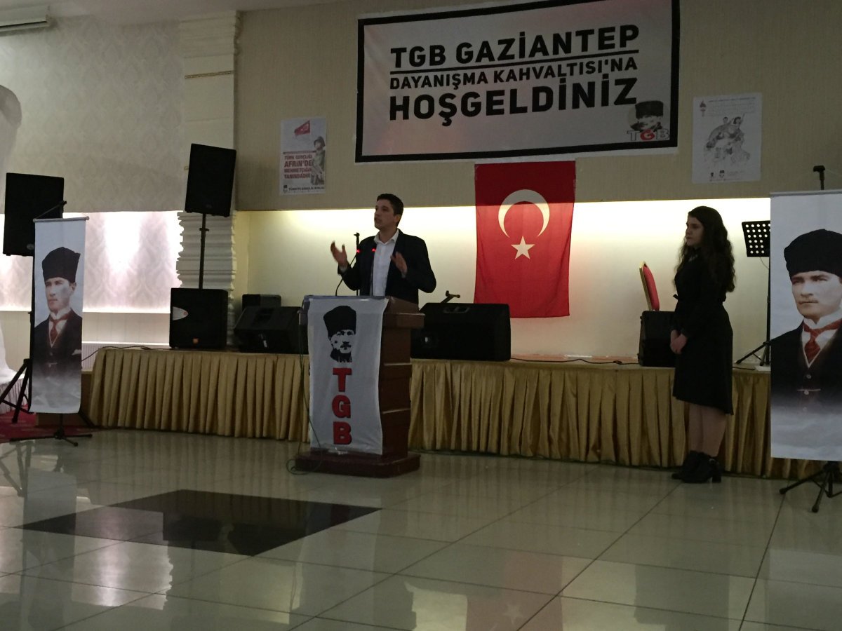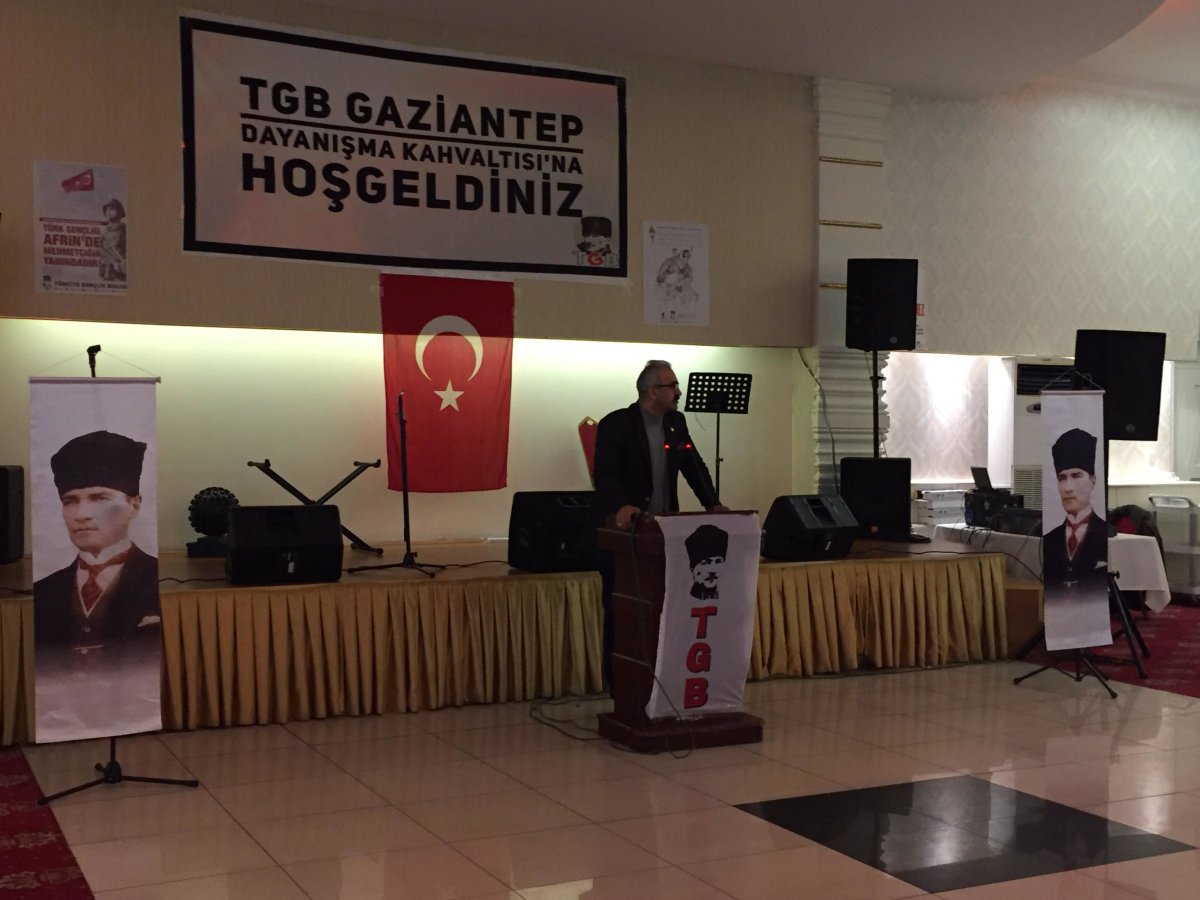 Dayanışma Kahvaltısı saygı duruşu ve İstiklal marşı ile başladı. Kahvaltının açılış konuşmasını yapan TGB Gaziantep İl Başkanı Kutluhan Tencan, sözlerine Cumhuriyetimizin kurucusu, devrimci önder Mustafa Kemal Atatürk’ün “Bütün ümidim gençliktedir” sözüyle Atatürk’ün gençliğe atfettiği “kararlılık ve heyecan” duygusuna vurgu yaptı. Tencan, bu kararlılık ve heyecan duygusunun TGB’nin mücadelesine yansıdığı konulara değindi.