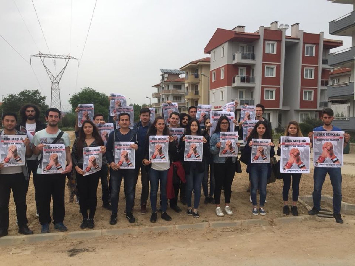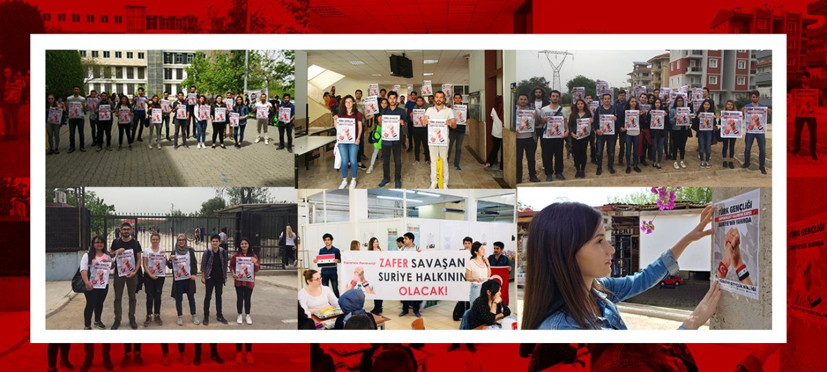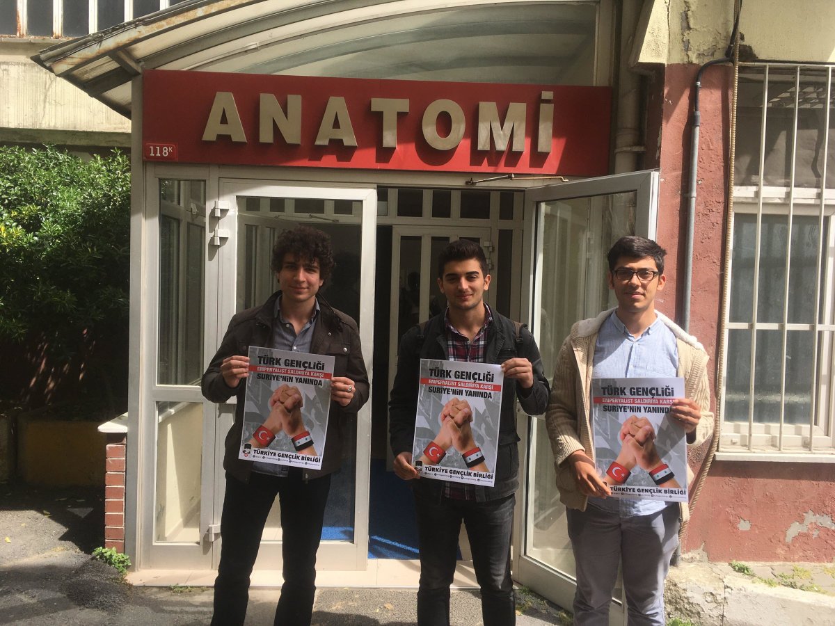 ABD, İngiltere ve Fransa’nın Suriye’yi bombalaması üzerine üniversitelerde çalışma başlatan TGB, fakültelerde basın açıklamaları yaparak “Türk Gençliği Emperyalizme karşı Suriye’nin yanında” yazılı afişler astı.