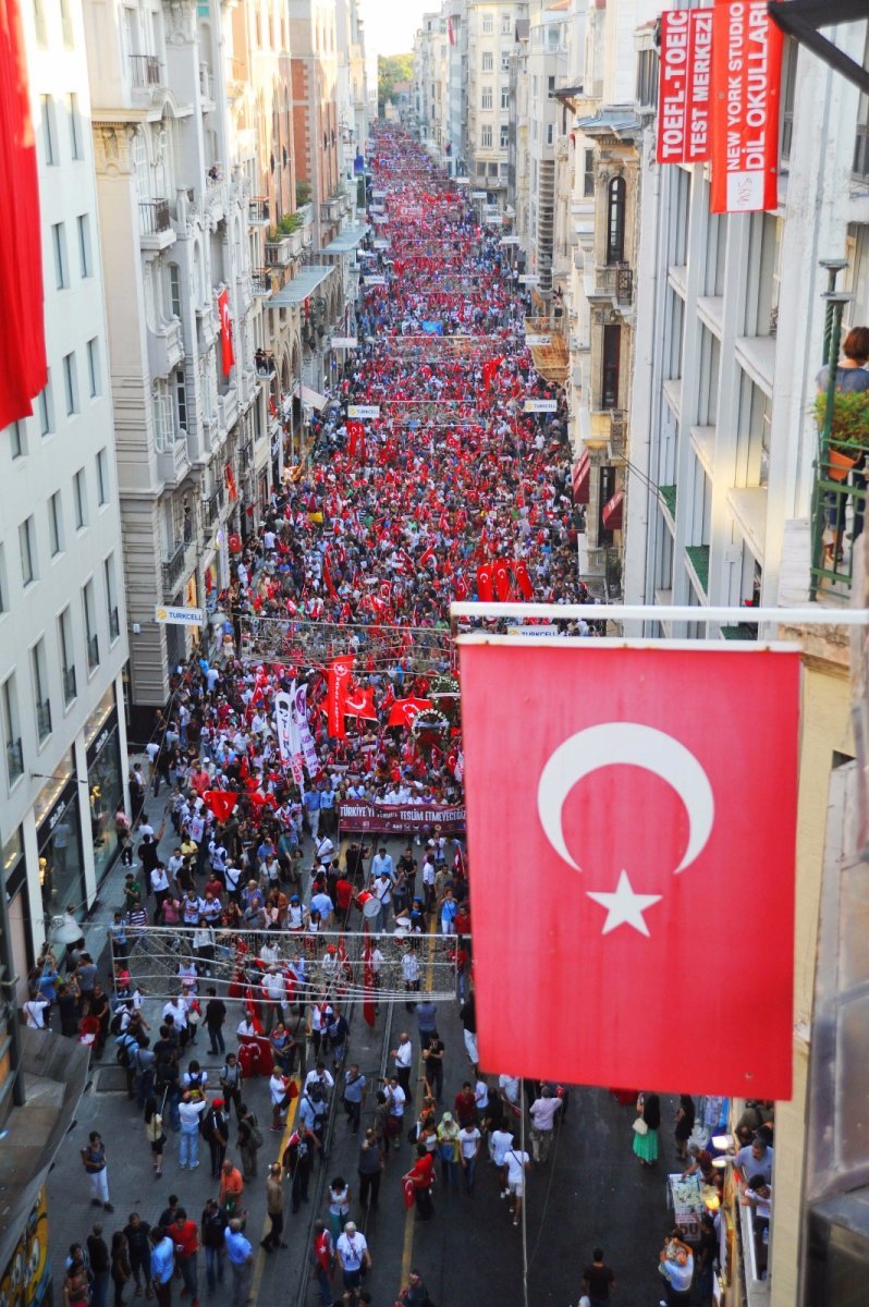 Amerikan destekli FETÖ, PKK, IŞİD terörüne karşı İstiklal Caddesi Tünel Meydanı’nda bir araya gelen yurttaşlar bando eşliğinde Galatasaray Lisesi önüne yürüdü. Yürüyüş sırasında sık sık ‘Ordu-Millet El Ele Tam Bağımsız Türkiye’ , ‘Kahrolsun PKK’, ‘Mustafa Kemal’in Askerleriyiz’, ‘Askeri Okullar Kapatılamaz’, ‘Türkiye Laiktir Laik Kalacak’ sloganları atıldı.