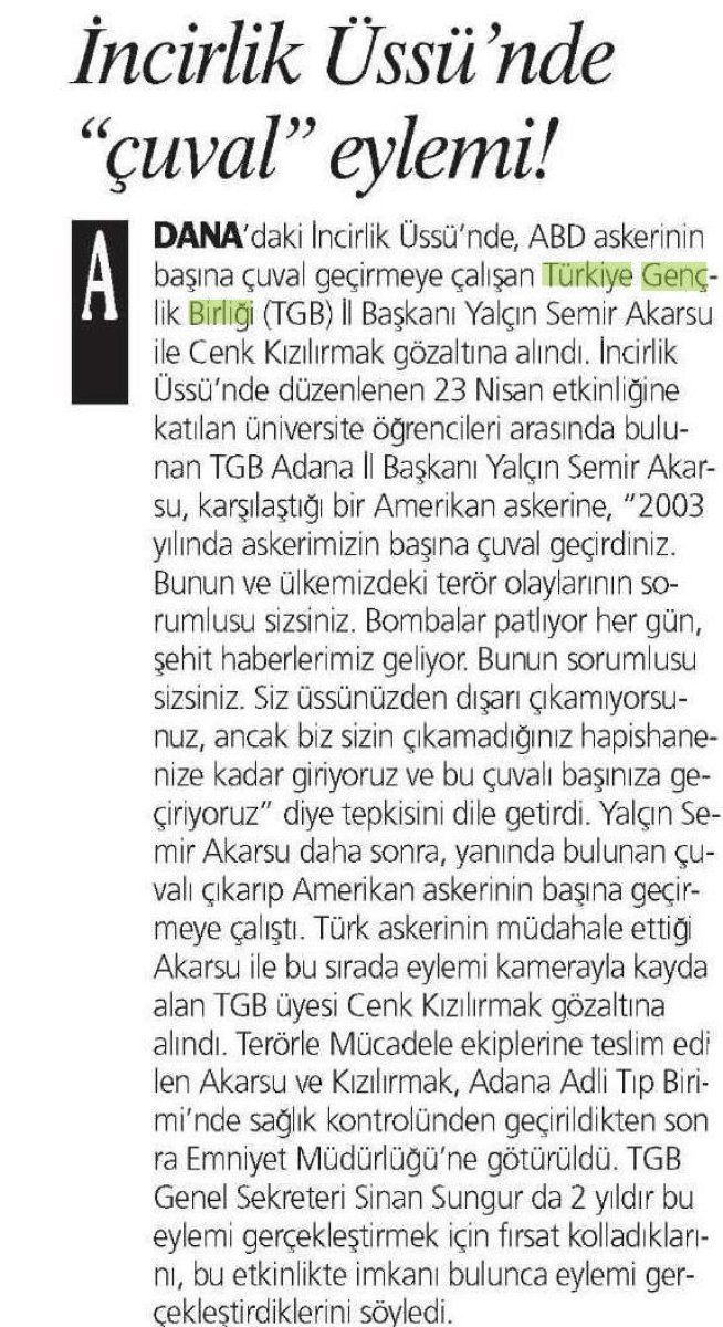 İncirlik Üssü’ne girip ABD askerini kovaladığımız eylem ulusal ve uluslararası basında büyük ölçüde yankı buldu. Bir çok tanınan gazetede ve internet sitesinde yer alan eylemimiz milyonlara ulaştı.