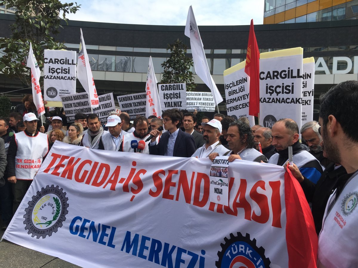 ABD merkezli gıda firması Cargill’den çıkarılan işçilerin direnişlerinin birinci yıldönümünde, işçiler Cargill şirketinin Türkiye’deki genel merkezi önünde toplandı. Tek Gıda-İş Sendikası Genel Teşkilat Sorumlusu İbrahim Ören, Cargill işçileri adına basın açıklaması yaptı. Ören “Cargill üretim devam ederken kota fazlalığı ve ekonomik daralmayı sebep gösterek sendikal örgütlenme yapan 14 işçiyi işten çıkarttı. Şirket aradan geçen bir yılda hukuk tanımazlığına devam etti. Anayasal hakları tanımamaya, üyelerimize mobing yaparak sendikal örgütlenmeye engel olmaya, sömürgeci Amerikan politikalarının işçi sınıfı üzerinde gölgesi olmaya devam ediyor. Şunu bilmelisiniz ki, burası Ortadoğu değil. Sömürgeci politikalarınıza asla ülkemizde izin vermeyeceğiz. Cargill işvereninin gerçek yüzünü tüm dünyaya haykırmaya devam edeceğiz. Mücadelemizin 1. yıl dönümünde asla yılmadan ve daha güçlü bir şekilde karşınızdayız. İşçi sınıfı Cargill direnişiyle tekrar umutlandı ve daha çok birbirine kenetlendi” dedi.