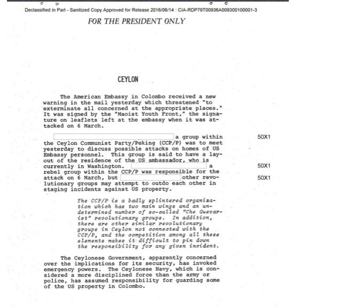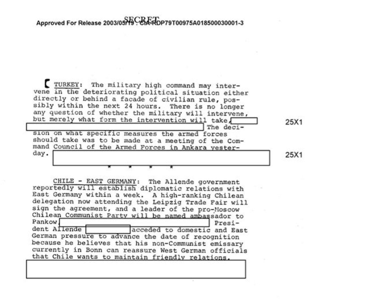 ABD Merkezi İstihbarat Teşkilatı (CIA) tarafından internet kullanıcılarının erişimine açılan belgelerde, 12 Mart 1971 tarihinde ordunun hükümete muhtıra verebileceğine dair bilginin bir gün önce CIA istihbarat bülteninde yer aldığı ortaya çıktı.