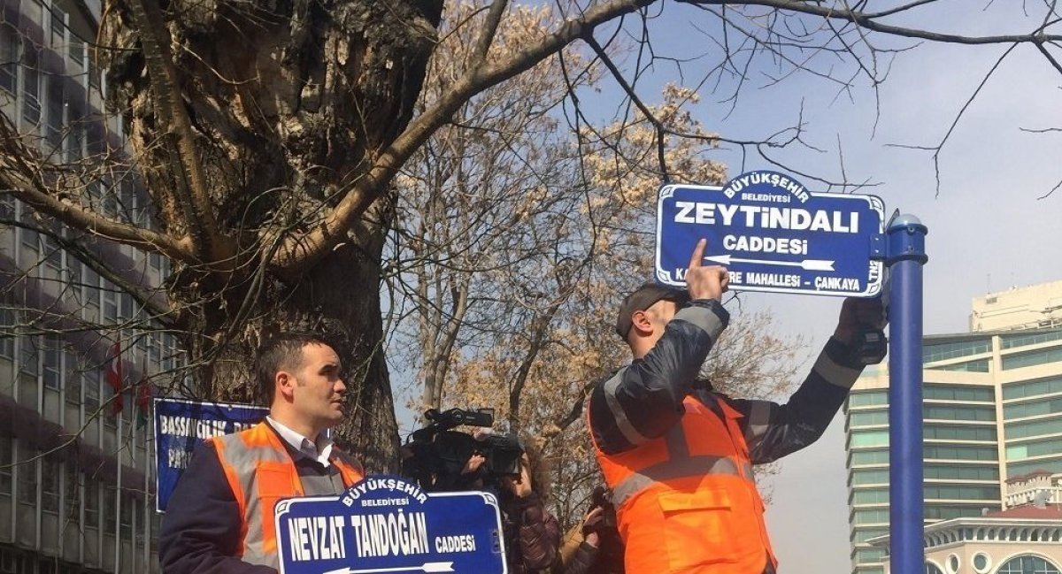 Fen İşleri Daire Başkanlığı’na bağlı Numerataj Şube Müdürlüğü ekiplerince caddenin adının bulunduğu direkteki “Nevzat Tandoğan” isim tabelası indirilerek yerine “Zeytindalı” yazılı tabela yerleştirildi.