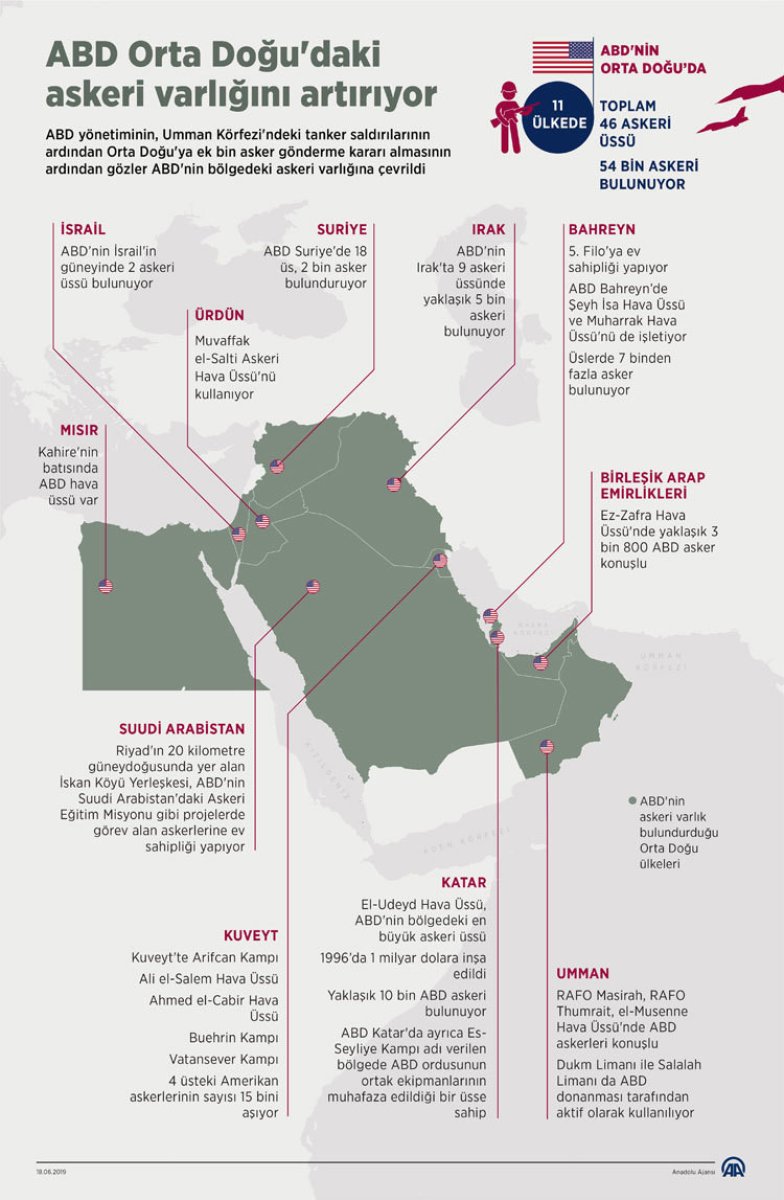 ABD’nin Ortadoğu ülkelerini ve Türkiye’yi bölmek, terör örgütlerini korumak ve eğitmek amacıyla, enerji yataklarını kontrolü altına almak için bölgede toplamda 46 askeri üssü ve 54 bin askeri mevcut!
