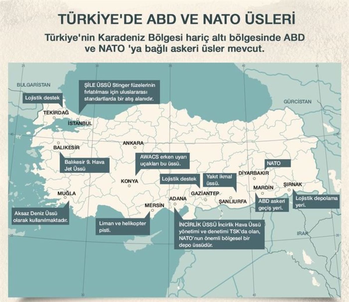 Türkiye’nin Karadeniz bölgesi hariç 6 bölgesinde ABD ve NATO’ya bağlı toplam 12 askeri üs bulunmakta.