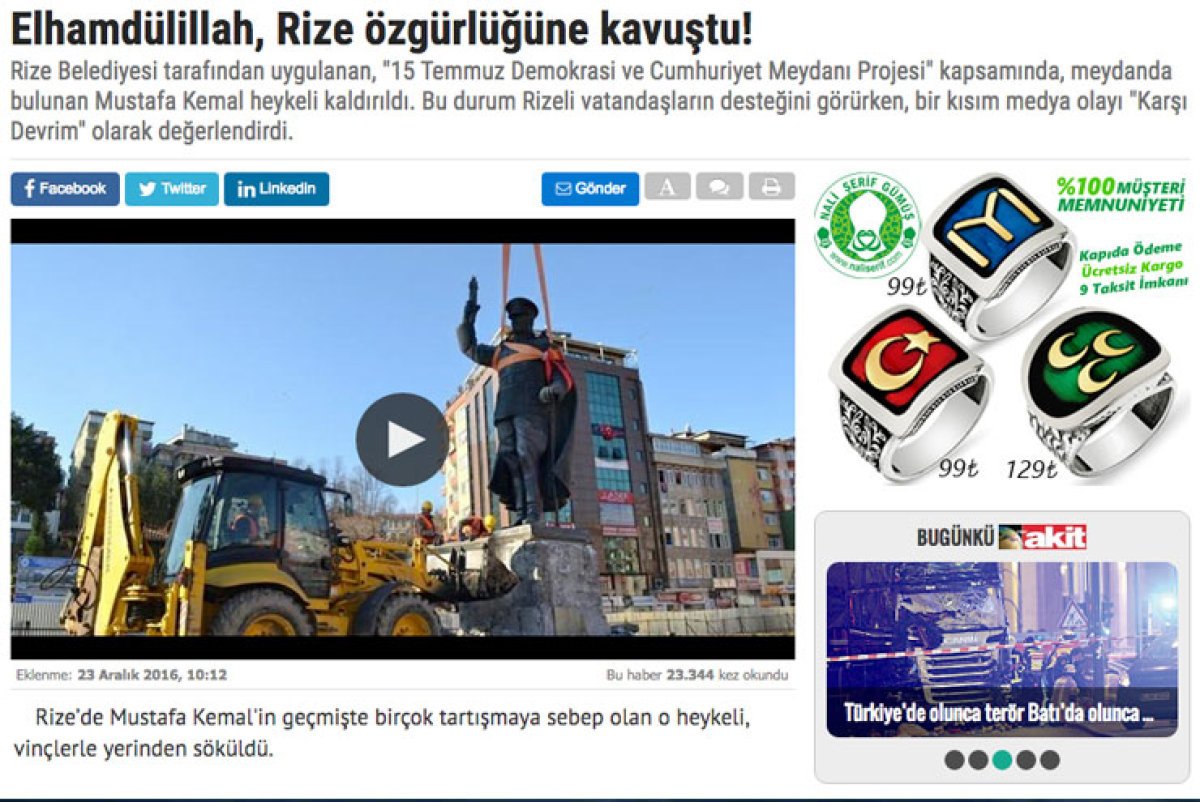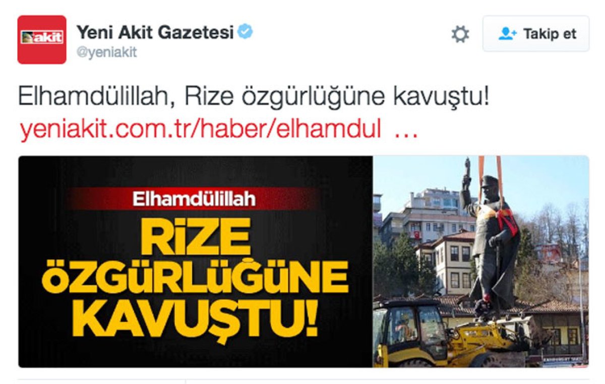 Provokatif yayınları ve azılı Atatürk düşmanlığıyla bilinen, iktidara yakın Yeni Akit Gazetesi, Rize’de 15 Temmuz Demokrasi ve Cumhuriyet Meydanı’ndaki Atatürk anıtının kaldırılmasını, ‘Elhamdülillah, Rize özgürlüğüne kavuştu!’ başlığıyla duyurdu.
