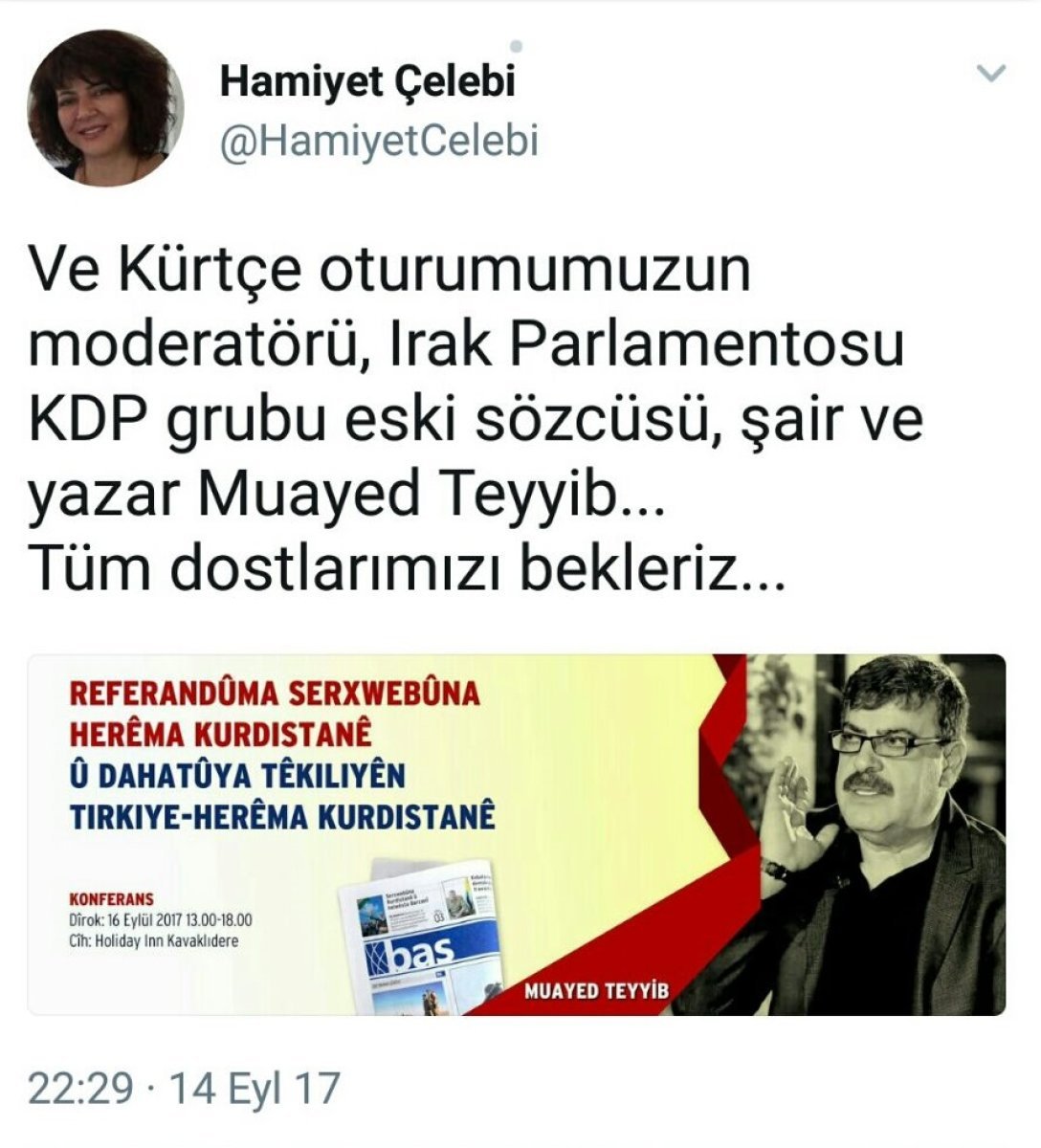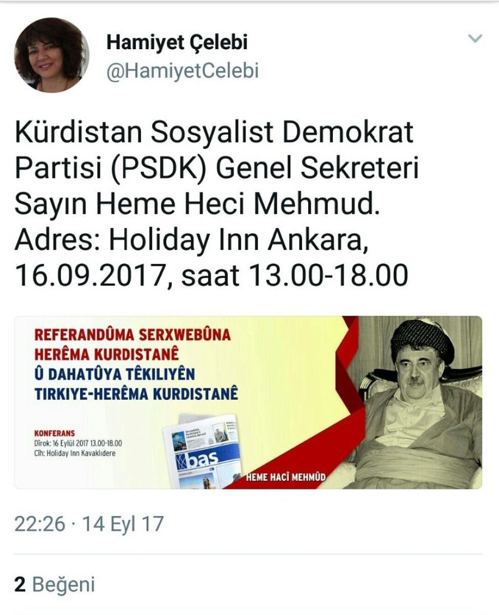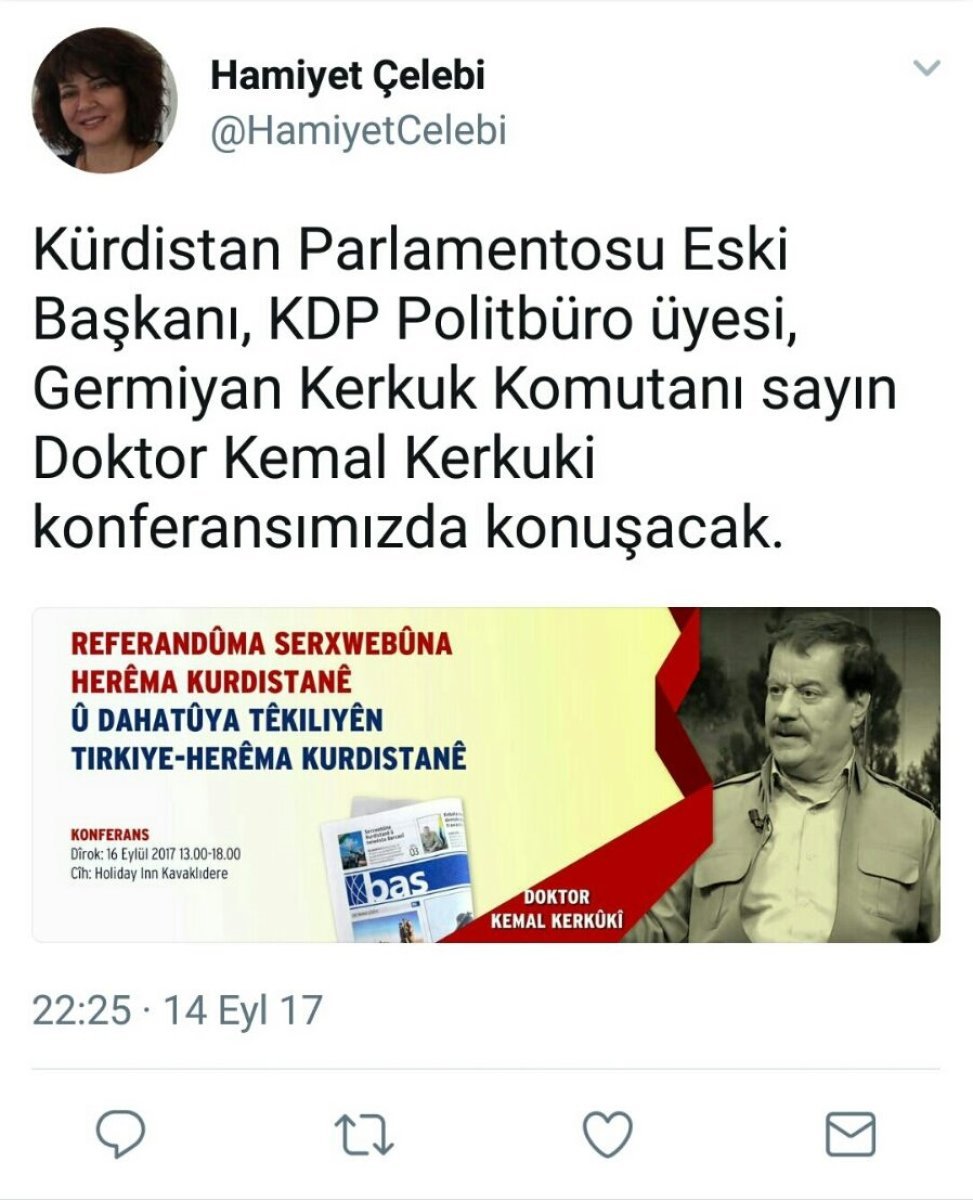 25 Eylül’de Irak’ın kuzeyinde düzenlenecek olan ve Irak’ı bölecek olan referandumun öncesinde PKK’nın Türkiye’deki girişimleri devam ediyor. Bölücü terör örgütü PKK’ya yakınlığı ile bilinen Bas gazetesinin düzenlediği “Kürdistan Bölgesi Bağımsızlık Referandumu ve Türkiye-Kürdistan Bölgesi ilişkilerinin Geleceği” konferansına sözde Kürdistan Parlamentosu eski Başkanı Kemal Kerküki, Kürdistan Sosyalist Demokrat Partisi Genel Sekreteri Hacı Mahmut ve Irak Parlamentosu KDP eski Sözcüsü Muayed Teyyip de katılacak. Konferans yarın Ankara’da düzenlenecek.