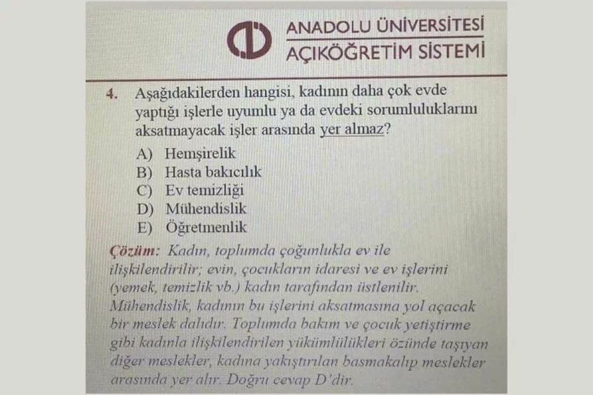 Anadolu Üniversitesi’nin Açıköğretim Fakültesi Sosyal Psikoloji 1 ders kitabında yer alan sorular tepki çekti. Sorular gibi şıkları da aynı şekilde cinsiyetçi ifadeler ve önermeler içerdi.