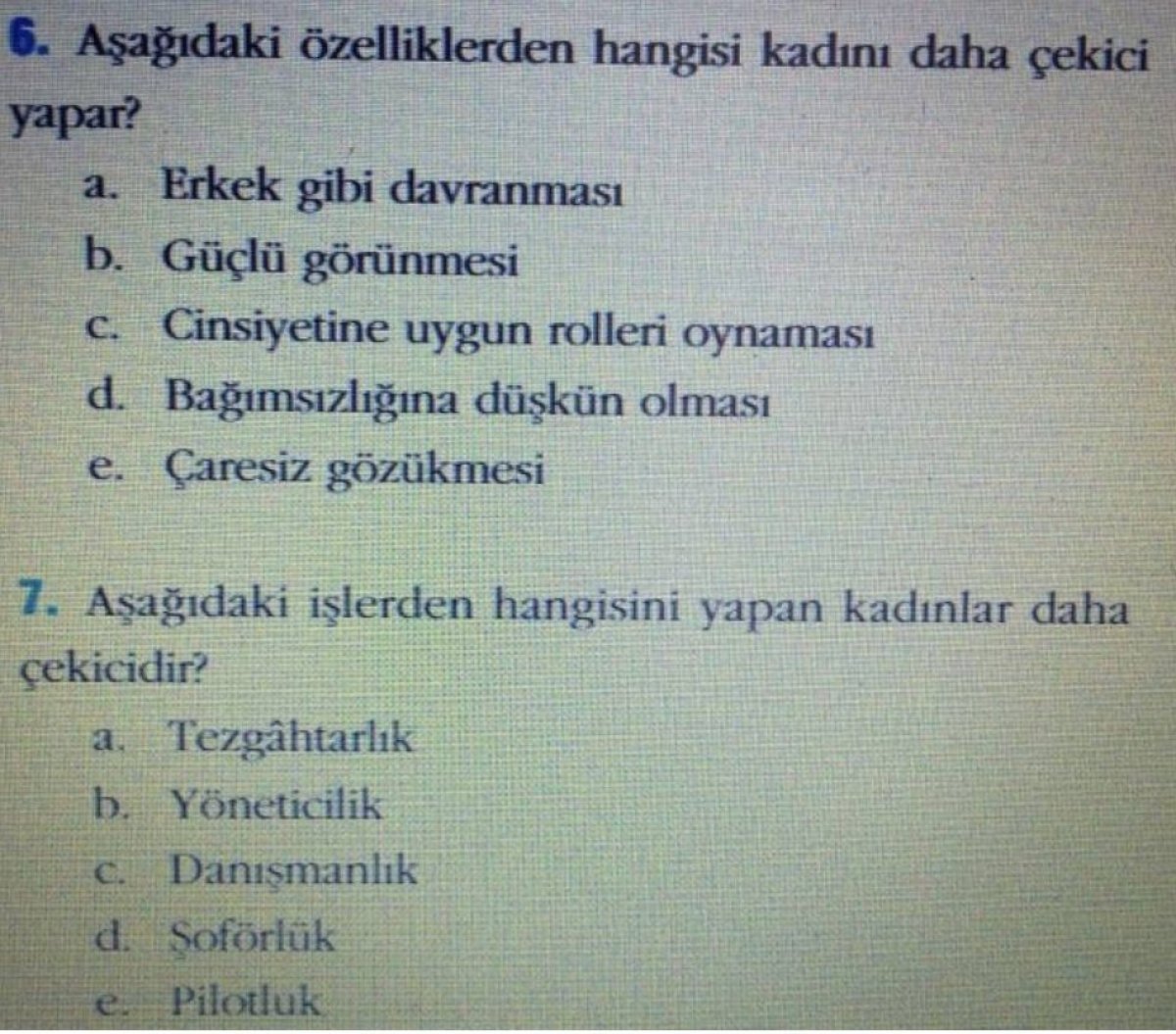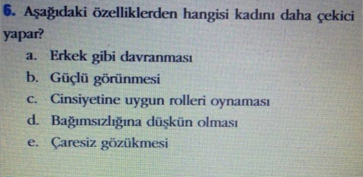 Anadolu Üniversitesi Açıköğretim Fakültesi Sosyal Psikoloji 1 ders kitabının test bölümünde “Kadını daha çekici yapan özellikler nelerdir?”, “Hangi işi yapan kadınlar daha çekicidir?”, “Erkeklerin eş seçerken önem verdikleri ölçüt nedir?” gibi sorular yer aldı.