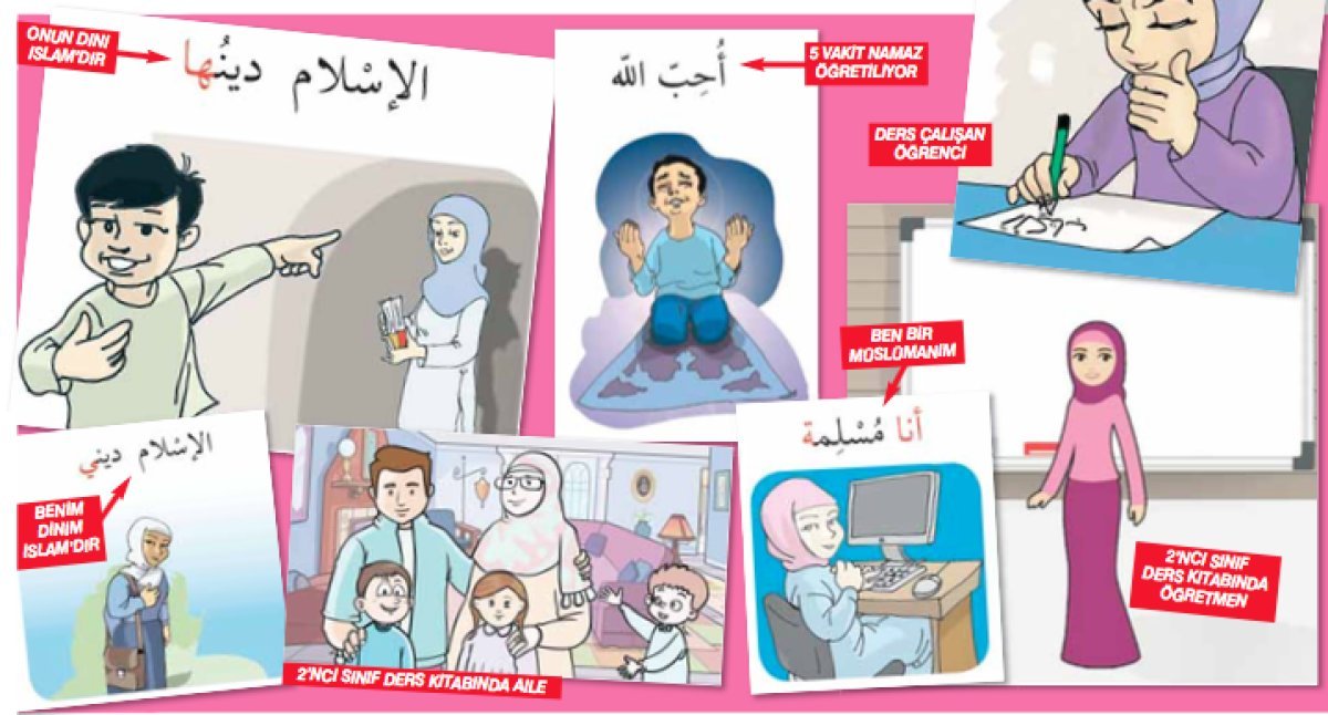 Arapça eğitiminin ders içeriği Din Öğretimi Genel Müdürlüğü tarafından belirlenendi. 2’nci ve 5’inci sınıflar için hazırlanan ders kitaplarını inceledik. Kitaplarda, kadınlar ve kız çocukları evde, okulda yaşamın her alanında türbanla resmediliyor. Tahtanın önünde ders anlatan öğretmenin başından   ayaklarına kadar örtündüğü görülüyor. Aile içinde kadının yeri evi. Anne ve kızı evde bulaşık yıkarken baba ve oğlu pazarda alışveriş yapıyor. 2’nci sınıf ders kitabında harfler öğretilirken 5’inci sınıf ders kitabında işin içine değerler eğitimi de giriyor.