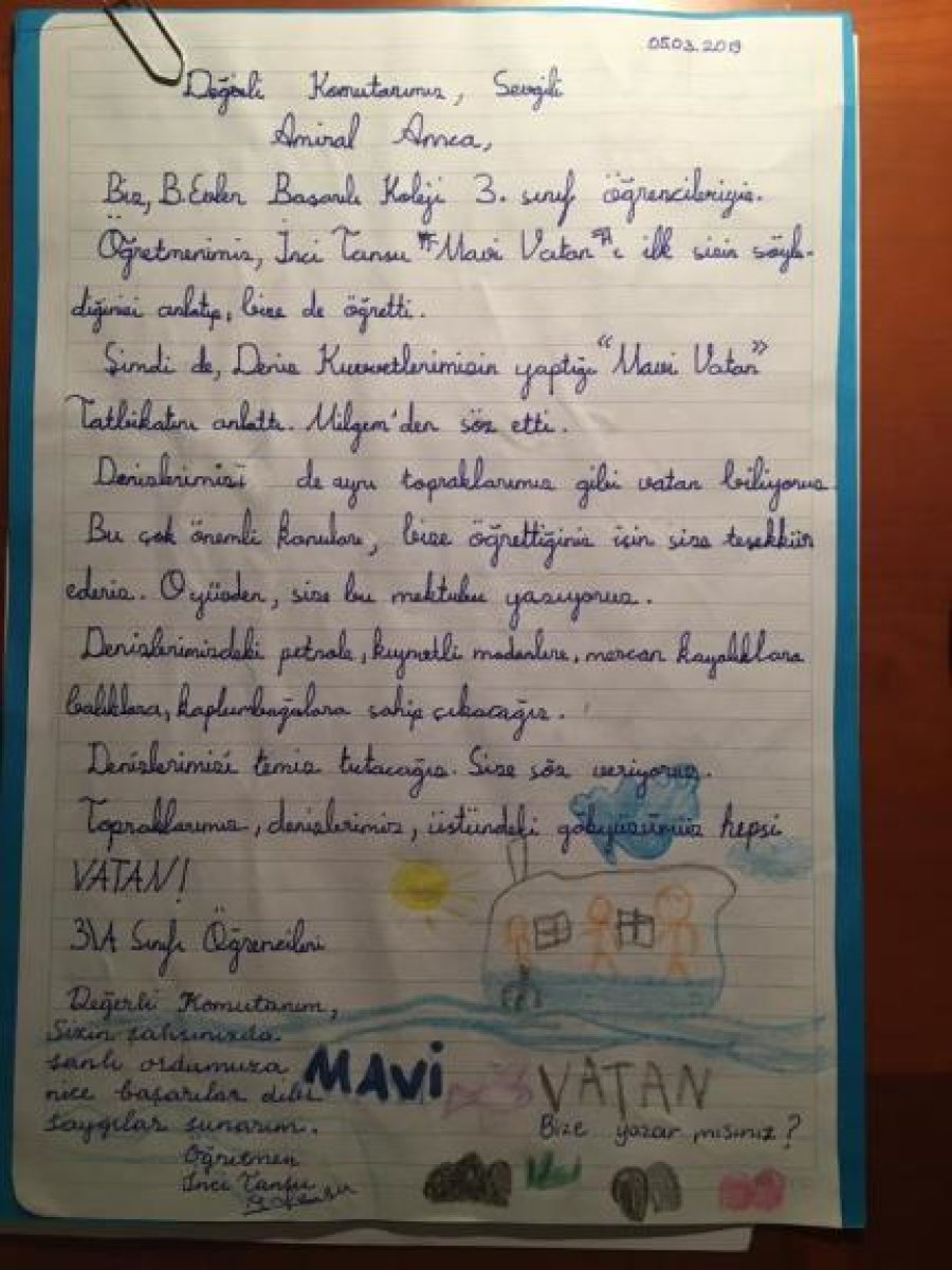 İlkokul üçüncü sınıf öğrencileri Amiral Cem Gürdeniz’e bir mektup yazdı. Mektupta, öğretmenleri İnci Tansu’nun, derslerde Gürdeniz’in yazılarından örneklerle Mavi Vatan’ı anlattığını belirten öğrenciler, Gürdeniz’e teşekkür etti. “Amiral Amca” diye başlayan mektupta, “Topraklarımız, denizlerimiz, gökyüzümüz… Hepsi vatan” ifadeleri yer aldı.