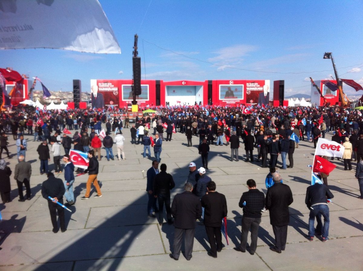 Bahçeli, Aydınlıkçıları da hedef alarak şu ifadeleri kullandı: “‘16 Nisan’da yüzde 100 evet çıksa da meşruiyeti yoktur diyen CHP’nin kayığına binip MHP’nin kıyılarına ok atan, demir parmaklıklardan tutup çamur siyasetine yatan tükenmiş siyaset kaçkınlarına uyku bile artık haramdır. Dünya üzerinde bunlara rahat ve huzur kalmamıştır. Sonları gelmiş, işleri bitmiş, fitnelerinde boğulma vakti yaklaşmıştır. Kaçacak tek yerleri ya Kandil ya da Pensilvanya’dır. Durmasın CHP ‘hayır’ desin, susmasın PKK ‘aman bittik’ diye hayır türküsü söylesin. Eli kanlı Aydınlıkçılar ‘hayır’ mayası çalmaya, FETÖ’cü hainler ‘hayır’ı savunmaya, DHKP-C, Avrupa ülkeleri ‘hayır’ propagandasına devam etsinler. Şunun şurasında 16 Nisan’a bir hafta vardır. Milli hesap bir hafta sonra görülecektir.” Bahçeli konuşmasında kitleye “Siz de ‘evet’ diyor musunuz?” diye sordu. Kitle sönük bir tonda “evet” yanıtı verdi. Cumhurbaşkanı Erdoğan ve Başbakan Binali Yıldırım’ın önceki gün aynı meydanda düzenlediği mitinge de katılım beklenenin altında kalmıştı. İstanbul Büyükşehir Belediyesi’nin İstanbul’un her yerinden ücretsiz araç kaldırmasına, tüm şehri afiş ve duyurularla doldurmasına rağmen AKP’nin eski mitinglerine göre katılım düşük oldu.