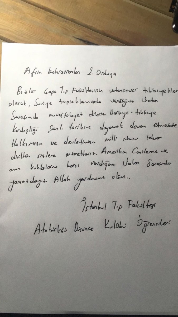 İstanbul Tıp Fakültesi Atatürkçü Düşünce Kulübü öğrenciler yazdığı mektupta şunları söyledi: “Afrin Kahramanları 2. Orduya,