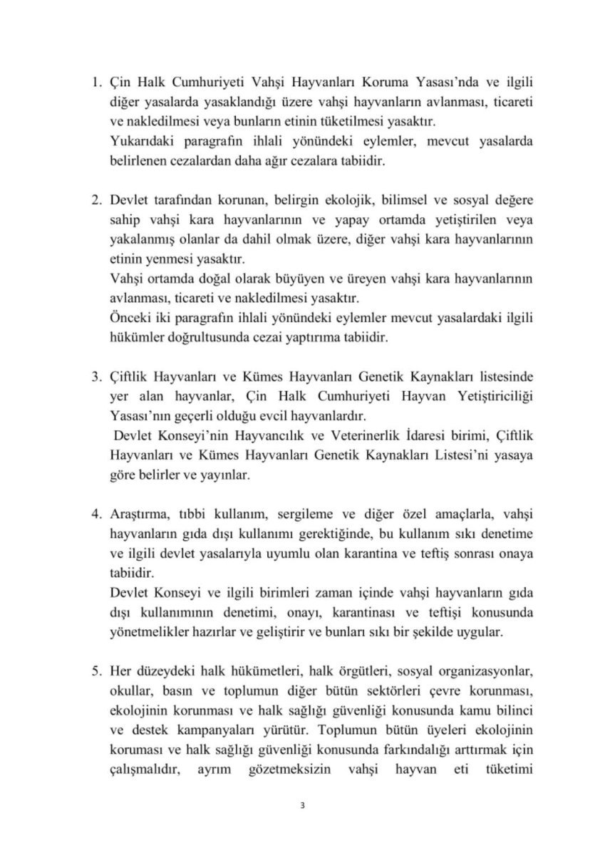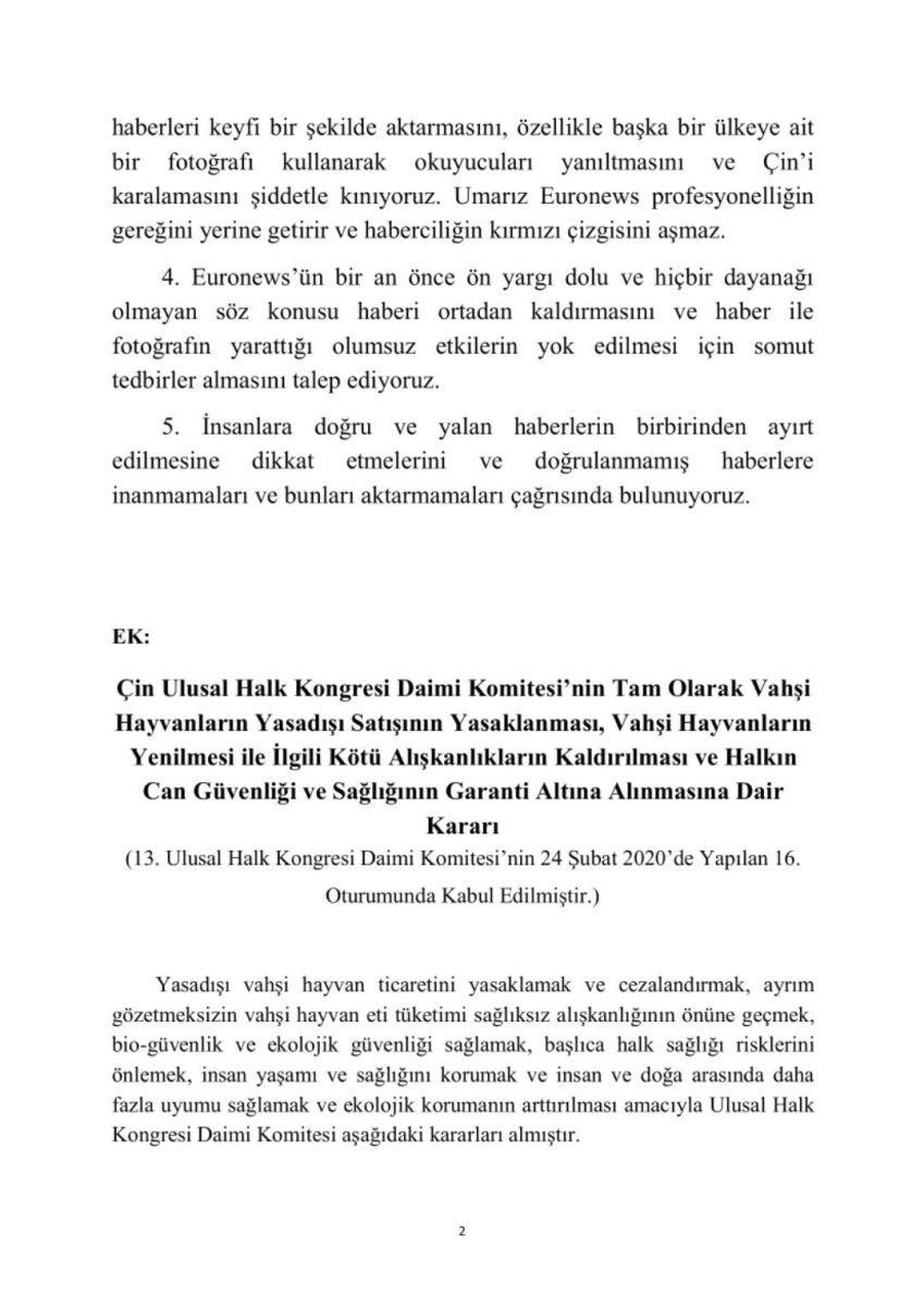 Ankara Çin Büyükelçiliğinden yapılan yazılı açıklamada, “24 Şubat’ta Çin Ulusal Halk Kongresi Daimi Komitesi Çin Ulusal Halk Kongresi Daimi Komitesi’nin tam olarak vahşi hayvanların yasadışı satışının yasaklanması, vahşi hayvanların yenilmesi ile ilgili kötü alışkanlıkların kaldırılması ve halkın can güvenliği ve sağlığının garanti altına alınmasına dair kararını kabul etmiştir. Yasadışı avlanma faaliyetleri, satış, nakliye ve vahşi hayvanların yenilmesi gibi davranışların ağır biçimde cezalandırılmasına karar verilmiştir. Bu karar kabul edildiği günden itibaren en sıkı şekilde uygulanmaktadır” ifadeleri kullanıldı.