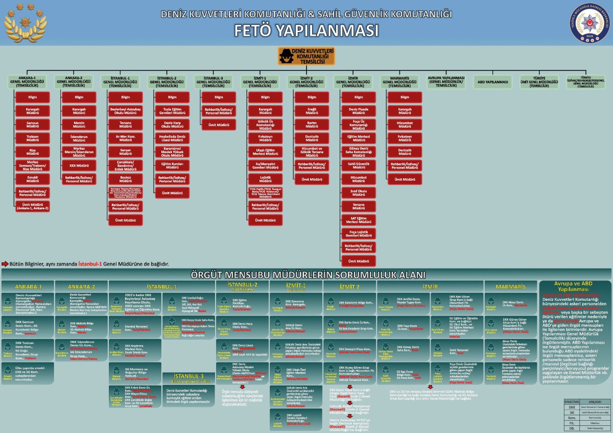 Deniz Kuvvetleri Komutanlığı’ndaki (DKK) FETÖ yapılanmasına ilişkin şemaya göre, DKK imamına bağlı 13 genel müdürlük bulunuyor. Bunların arasında ABD ve Avrupa yapılanması da yer alıyor. Avrupa ve ABD yapılanmaları, DKK bünyesindeki askeri personelden yüksek lisans, doktora, askeri eğitim, görev gereği (askeri ataşelik) Avrupa ve ABD’ye giden örgüt mensupları ile ilgilenen birimlerdir. Raporda, örgütün, her bir genel müdürlüğü rakamla kodladığı da belirtildi. Örgüt müdürlükleri 20’den 31’e kadar rakamla kodlamış.