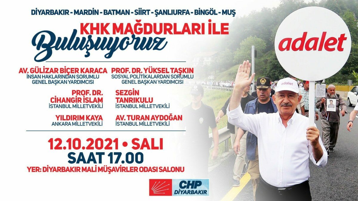 CHP, KHK’lılarla düzenlediği buluşmalara yarın Diyarbakır’da devam edecek. Diyarbakır, Mardin, Batman, Siirt, Şanlıurfa, Bingöl ve Muş’tan gelecek KHK’lılarla düzenlenecek buluşmada Gülizar Biçer Karaca, Yüksel Taşkın, Cihangir İslam, Sezgin Tanrıkulu, Yıldırım Kaya, Turan Aydoğan da yer alacak. CHP’den yapılan açıklamada, buluşmalara Diyarbakır’ın ardından 13 Ekim’de Van, 14 Ekim’de Malatya ve gelecek hafta da Trabzon, Samsun, Kayseri’yle devam edileceği duyuruldu.