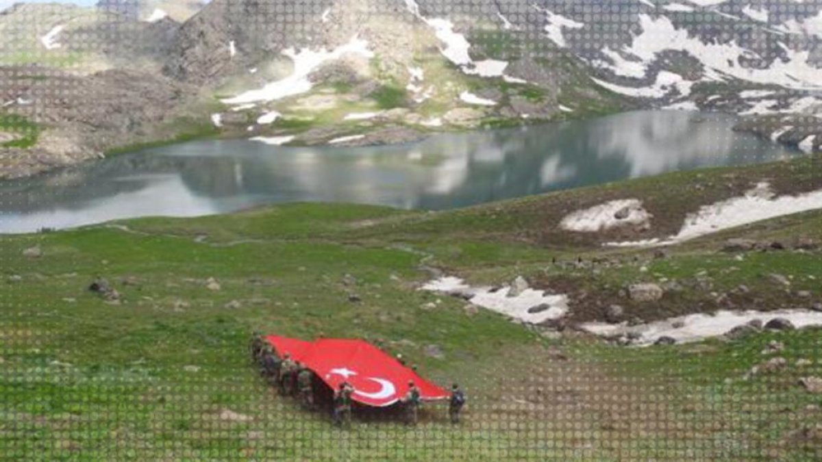 Hakkari’deki İkiyaka Dağları’nda dev Türk bayrağı açan Mehmetçik, namaz kılıp İstiklal Marşı okudu.