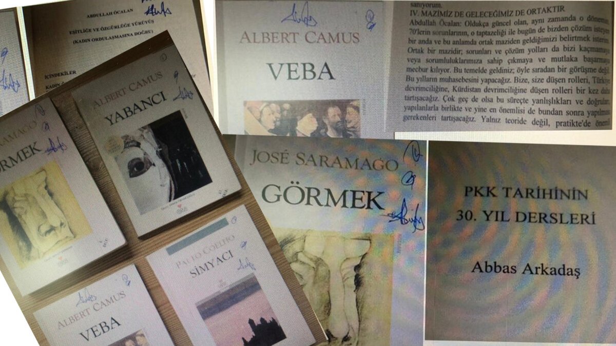 Kitaplarda yapılan incelemelerde PKK elebaşı Abdullah Öcalan’a ait eserlerin, dünya klasikleri kapakları kullanılarak kamufle edildiği ortaya çıkarıldı. Bu eserler arasında Jose Saramago’ya ait ‘Görmek’, Albert Camus’a ait ‘Yabancı’ ve ‘Veba’, Paulo Coelho’ya ait ‘Simyacı’ adlı dünya klasikleri yer aldı. İncelemelerde Jose Saramago’ya ait ‘Görmek’ isimli eserin kapağı kullanılırken, içeriğinde ise ‘PKK Tarihinin 30. Yıl Dersleri’ isimli örgütsel dokümanına rastlandı.