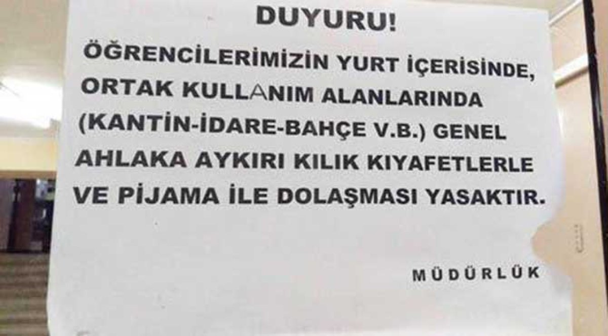 İzmir Buca Ahmet Yesevi Kız Öğrenci Yurdu’nda Müdürlük imzası ile öğrencilerin yurt içerisinde ortak kullanım alanlarında ‘genel ahlaka aykırı kılık kıyafetlerle ve pijama ile dolaşmasına yasak geldi.
