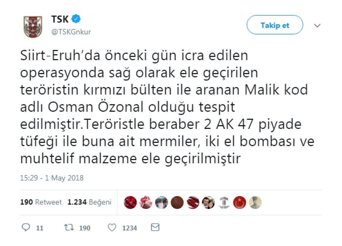 Genelkurmay Başkanlığından yapılan açıklamada “Siirt-Eruh’da önceki gün icra edilen operasyonda sağ olarak ele geçirilen teröristin kırmızı bülten ile aranan Malik kod adlı Osman Özonal olduğu tespit edilmiştir.Teröristle beraber 2 AK 47 piyade tüfeği ile buna ait mermiler, iki el bombası ve muhtelif malzeme ele geçirilmiştir” denildi.