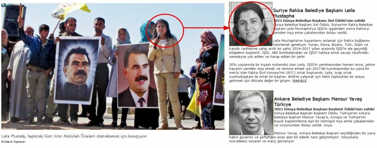 Dünya Belediye Başkanı Projesi kapsamında çeşitli ödüller dağıtan Belediye Başkanları Vakfı’nın, Mansur Yavaş ile beraber terör örgütü PKK’nın Suriye’deki uzantısı olan YPG’ye bağlı Rakka’da eş Belediye Başkanı olan Leila Mustapha’ya (Leyla Mustafa) da ödül verdiği ortaya çıktı.