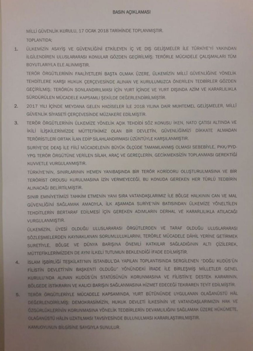 “Türkiye’nin sınırlarının hemen yanı başında bir terör koridoru oluşturulmasına ve bir terörist ordusu kurulmasına izin vermeyeceği, bu konuda gereken her türlü tedbirin alınacağı belirtilmiştir” ifadesinin vurgulandığı MGK toplantısının ardından Mehmetçik, Afrin operasyonu için düğmeye bastı. Sınıra birçok zırhlı araç bu bağlamda konuşlandırıldı.