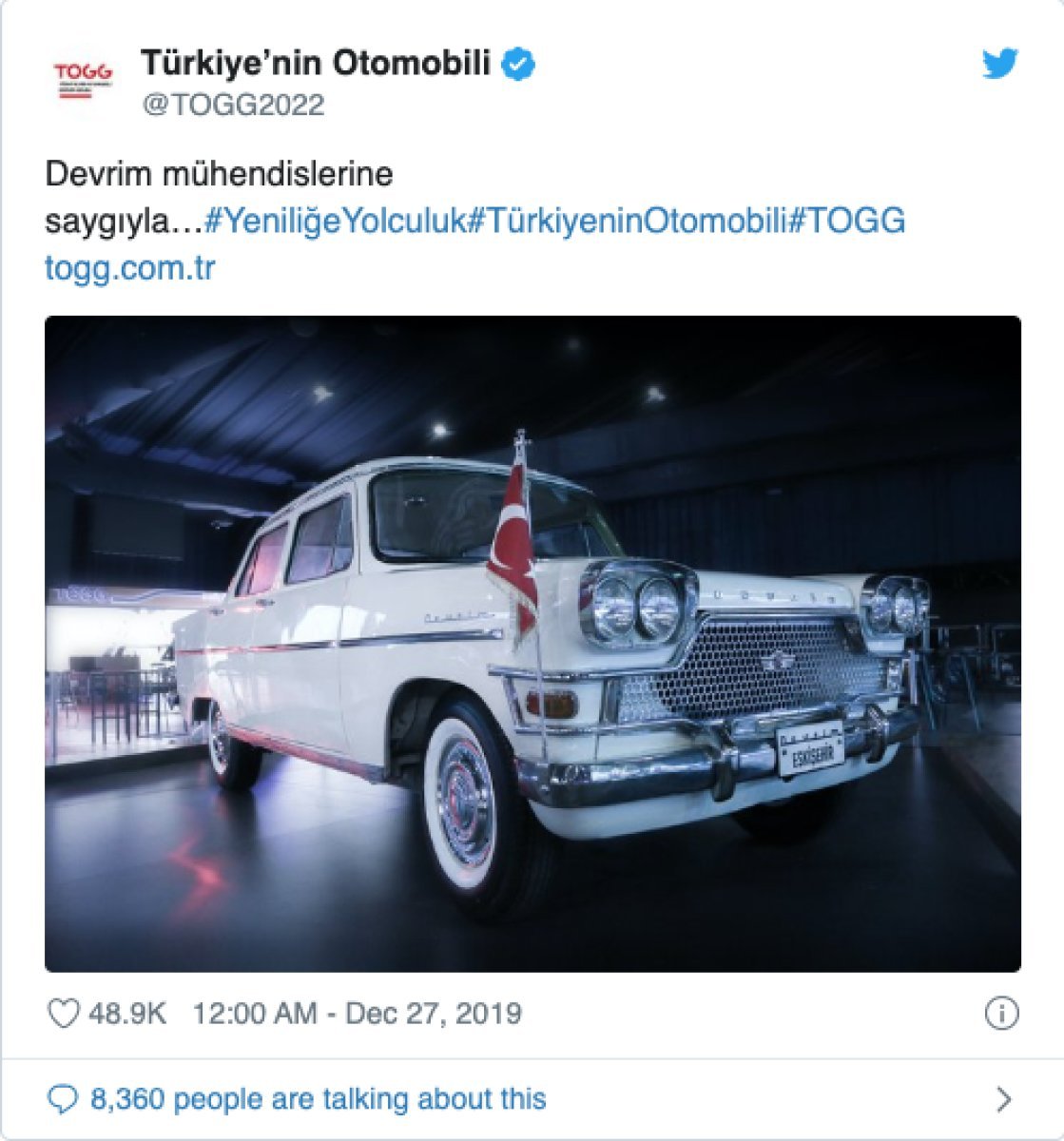 Türkiye’nin Otomobili Girişim Grubu’nun (TOGG) resmi Twitter sayfasından “Devrim mühendislerine saygıyla…” notuyla Türkiye’nin ilk yerli otomobili “Devrim”in bir fotoğrafı paylaşıldı.