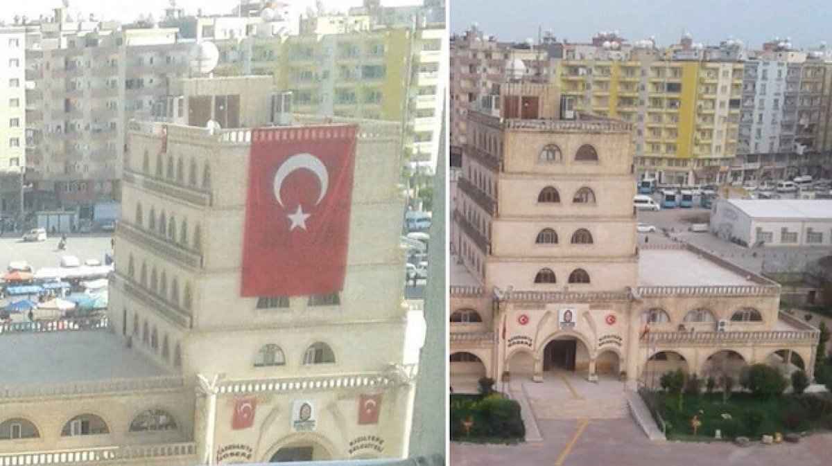 Göreve başlamasıyla kayyum döneminde binaya asılan Türk bayraklarının belediye binasından dev kaldırıldığı görüldü.